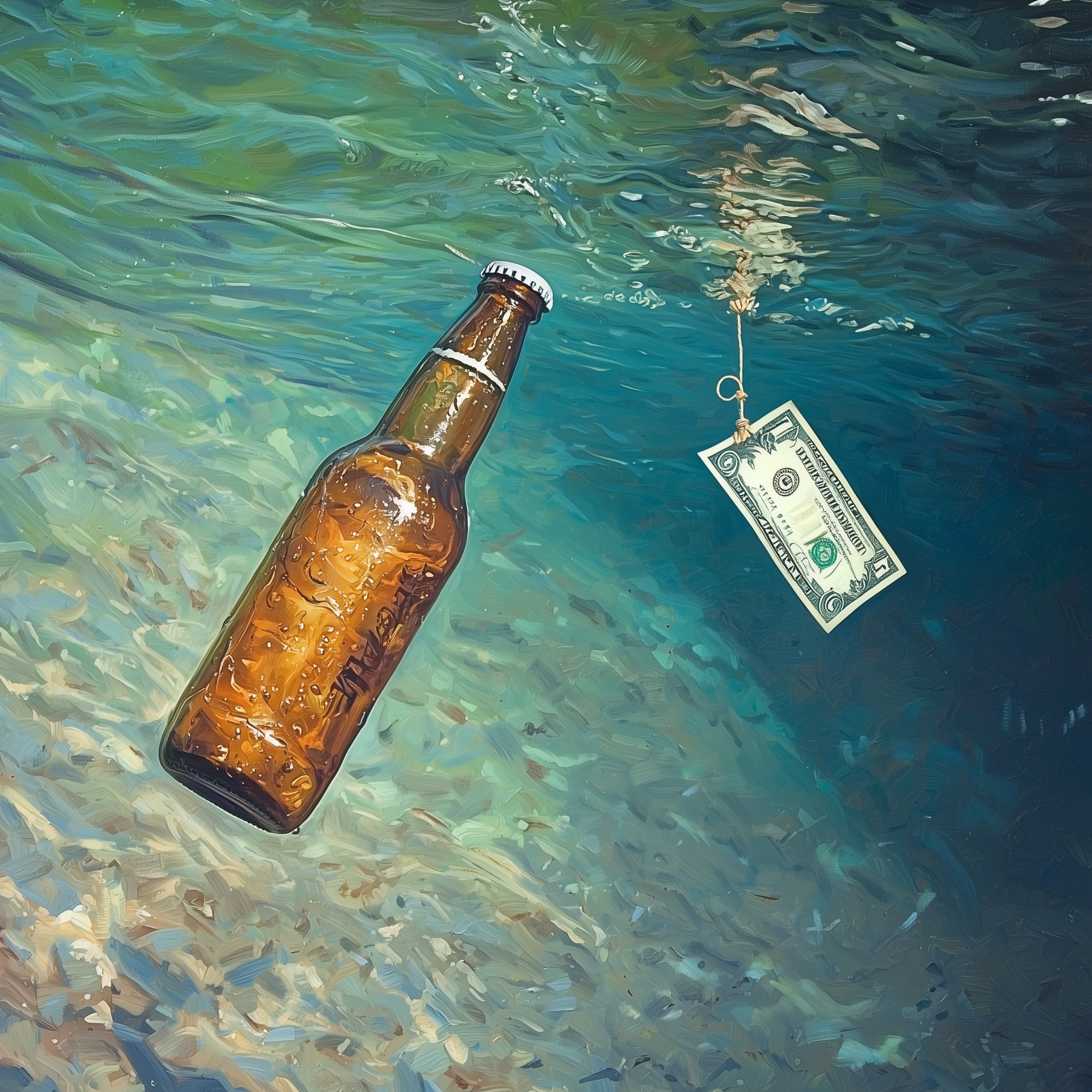 This image depicts a surreal scene where a beer bottle is playfully swimming in crystal clear water, striving to catch a dollar bill that dangles from a hook. The overall composition evokes a sense of carefree exploration, reminiscent of a famous album cover aesthetic.