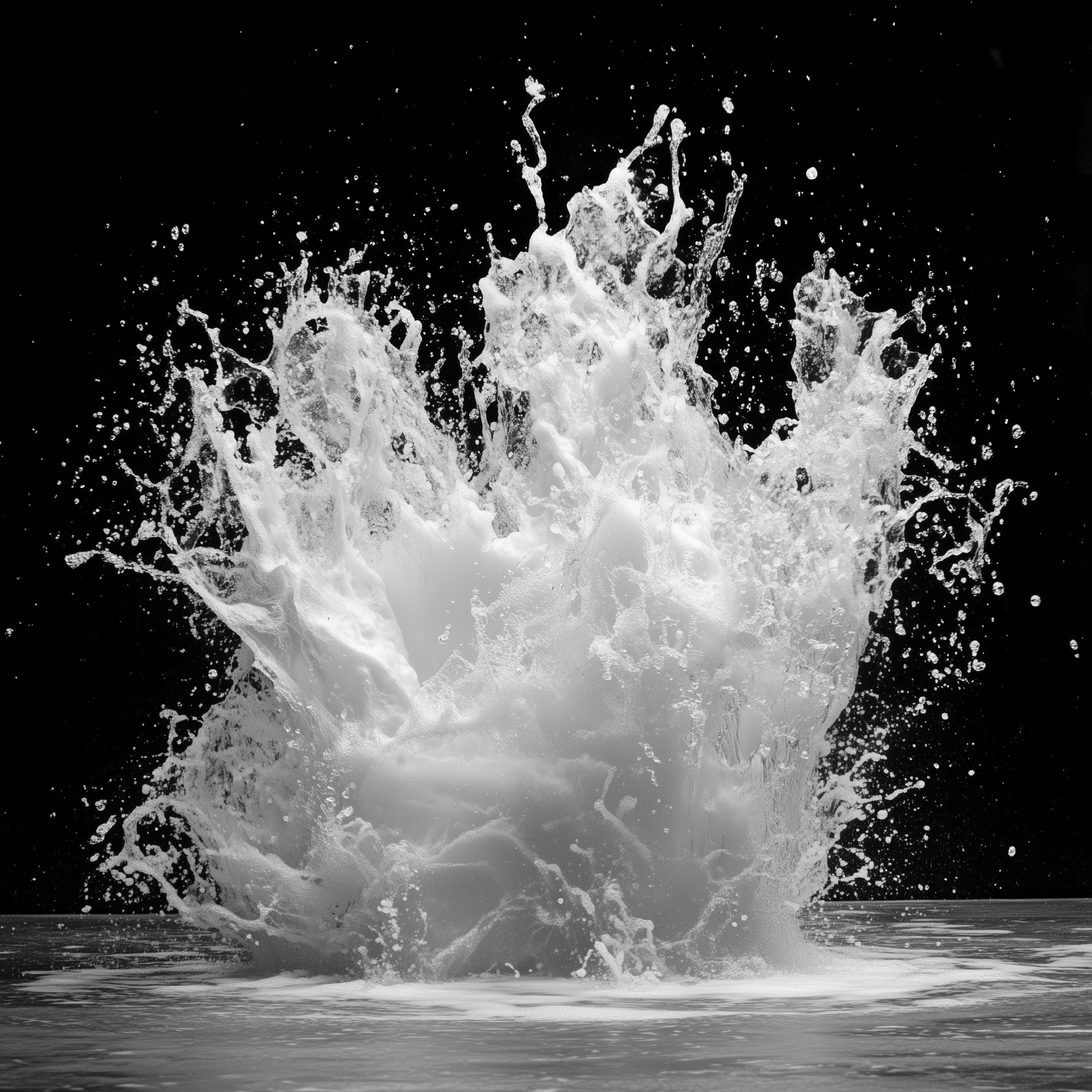 The image captures a large splash of water, creating an energetic and dynamic pattern against a stark black background. The contrast highlights the fluidity and movement of the water, evoking a sense of freshness and vitality.