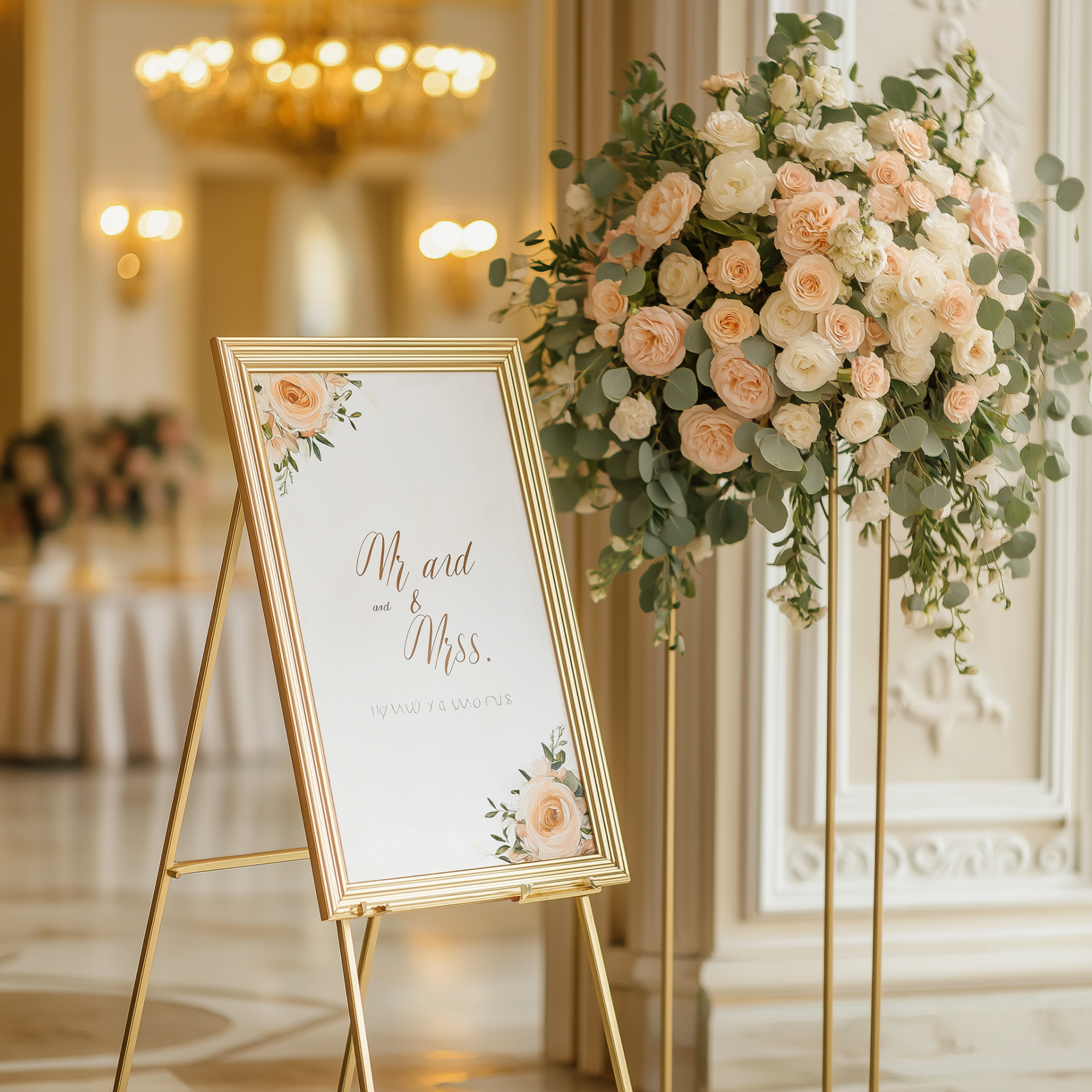This mockup features an elegant wedding welcome sign adorned with a luxurious gold frame and beautiful floral accents. The text 'Mr. and Mrs.' is prominently displayed, creating a romantic and inviting atmosphere for guests.