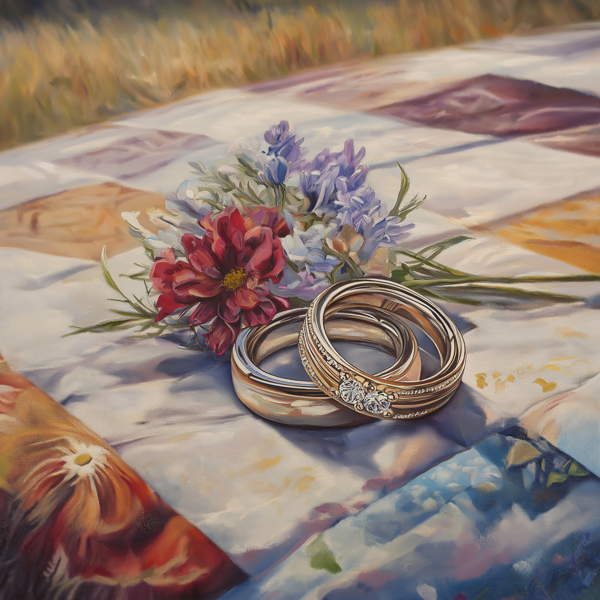 This image captures a beautiful landscape scene with two wedding rings elegantly intertwined, adorned with delicate flowers. The rings sit atop a visually striking barn quilt, featuring an intricate design that adds to the rustic charm of the composition.