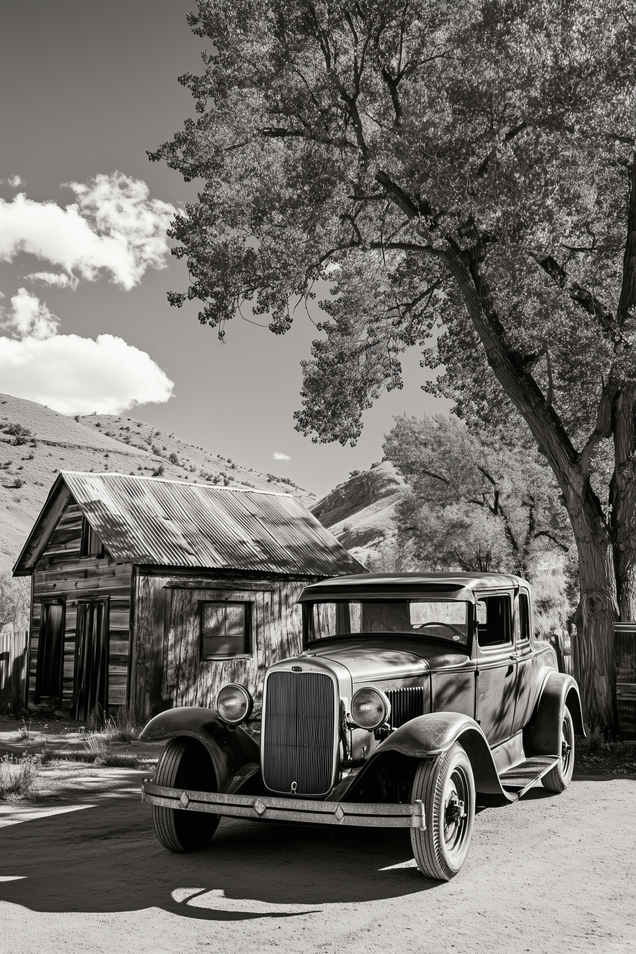 The image captures a nostalgic essence of the American West, rendered in striking black and white. It evokes a sense of timelessness and vintage charm, showcasing everyday life in a retro style.