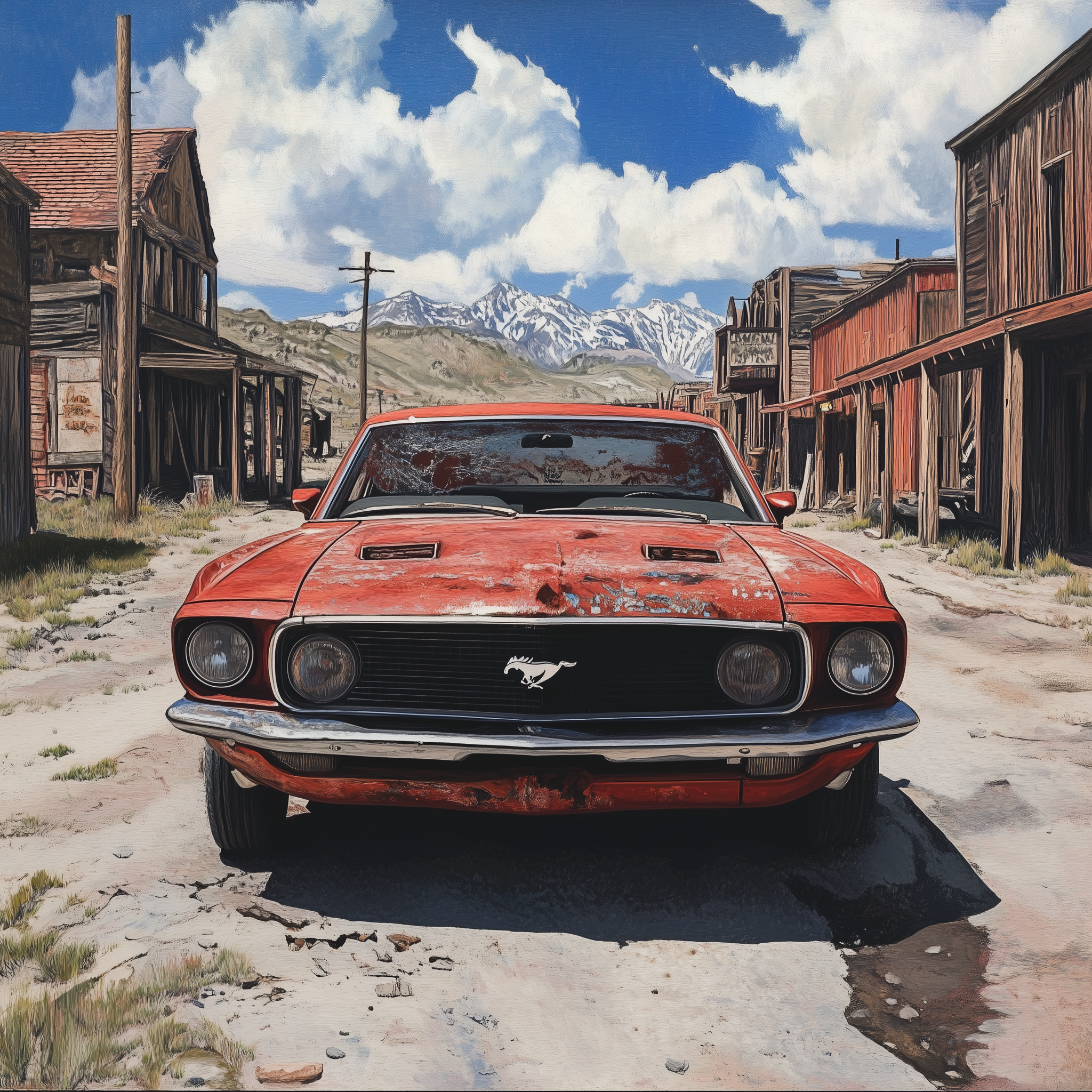 A vintage red Ford Mustang parked in a dusty, deserted western town, under the scorching sun. The old, weathered buildings and empty streets create a sense of abandonment and nostalgia.