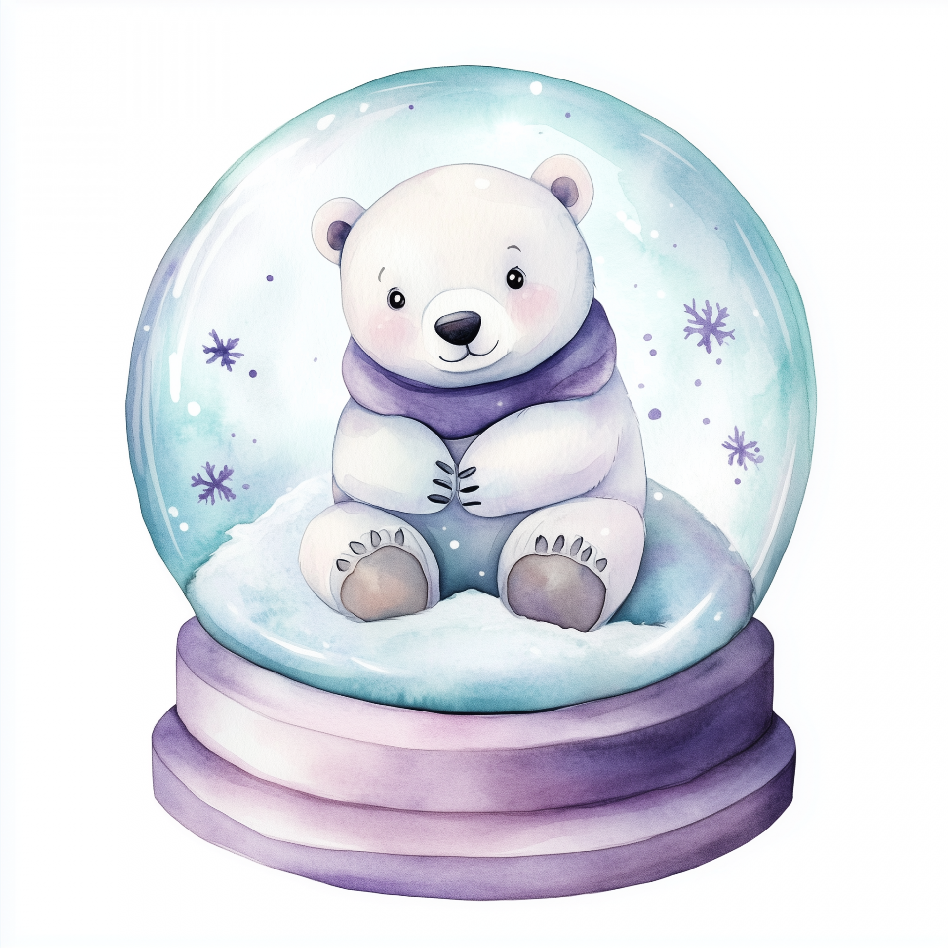 This illustration features an adorable polar bear trapped inside a snowglobe, surrounded by an enchanting atmosphere. The snowglobe rests on a charming purple and mint base, set against a clean white background.