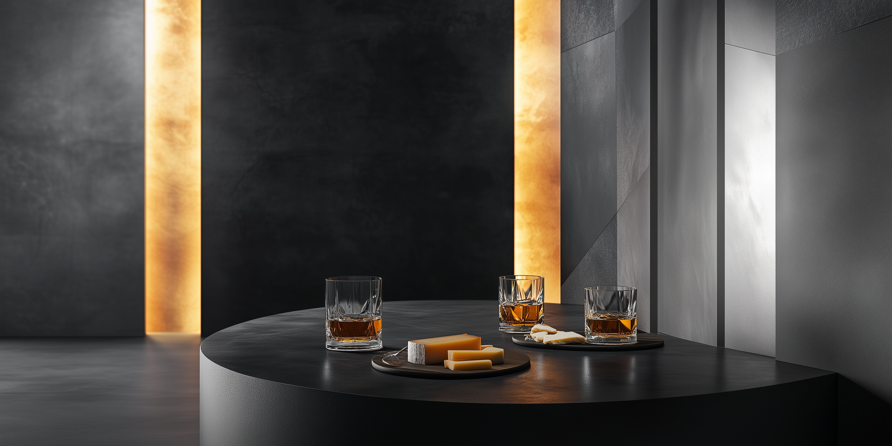 This image features a beautifully arranged tabletop scene in dark grey tones with a geometric backdrop. Whisky glasses and a cheese platter are elegantly displayed, creating a sophisticated atmosphere enhanced by a soft glow in the background.