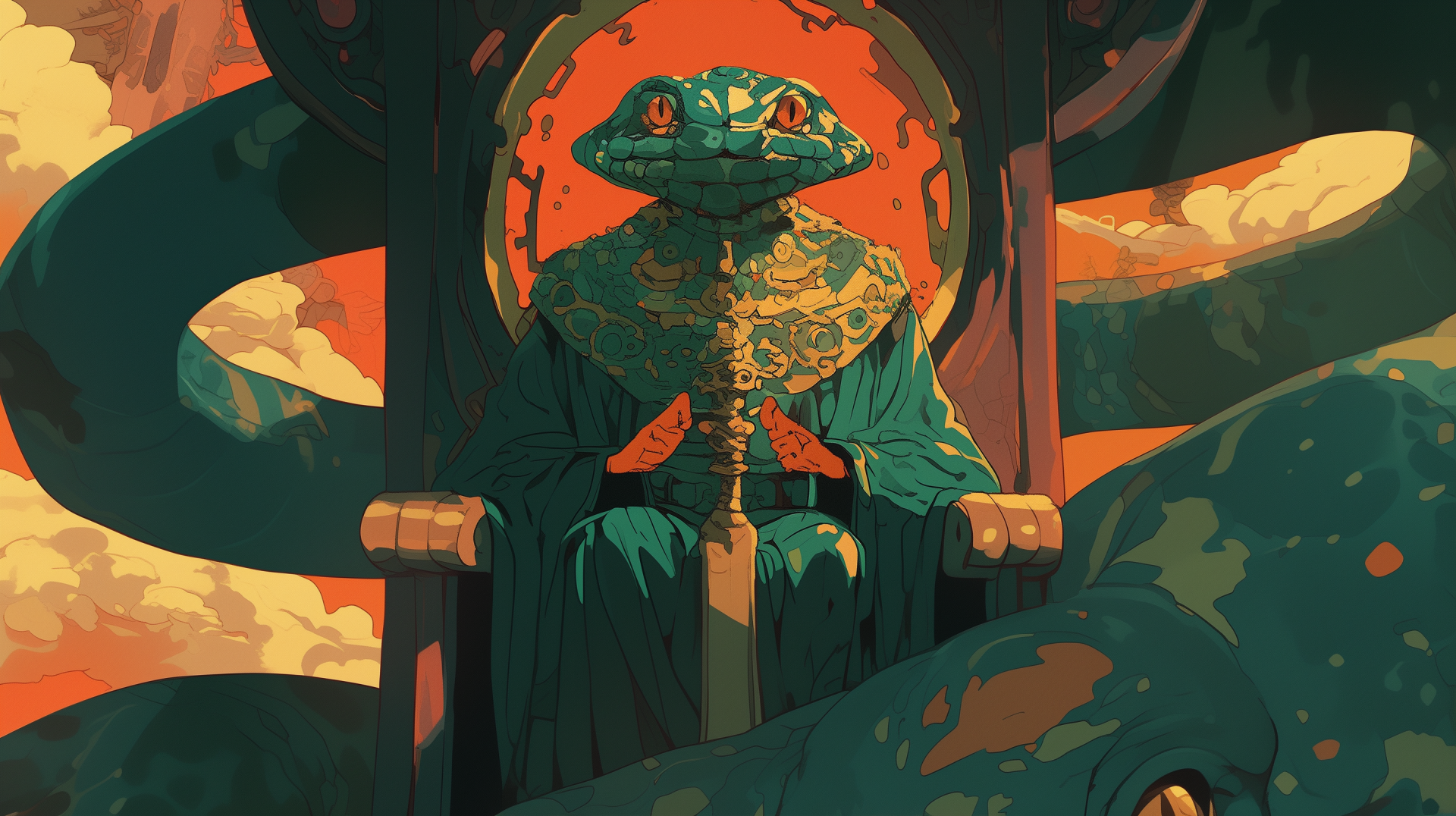 The illustration showcases a majestic snake coiled gracefully with intricate patterns on its scales. Its vibrant colors and regal posture evoke a sense of power and elegance.