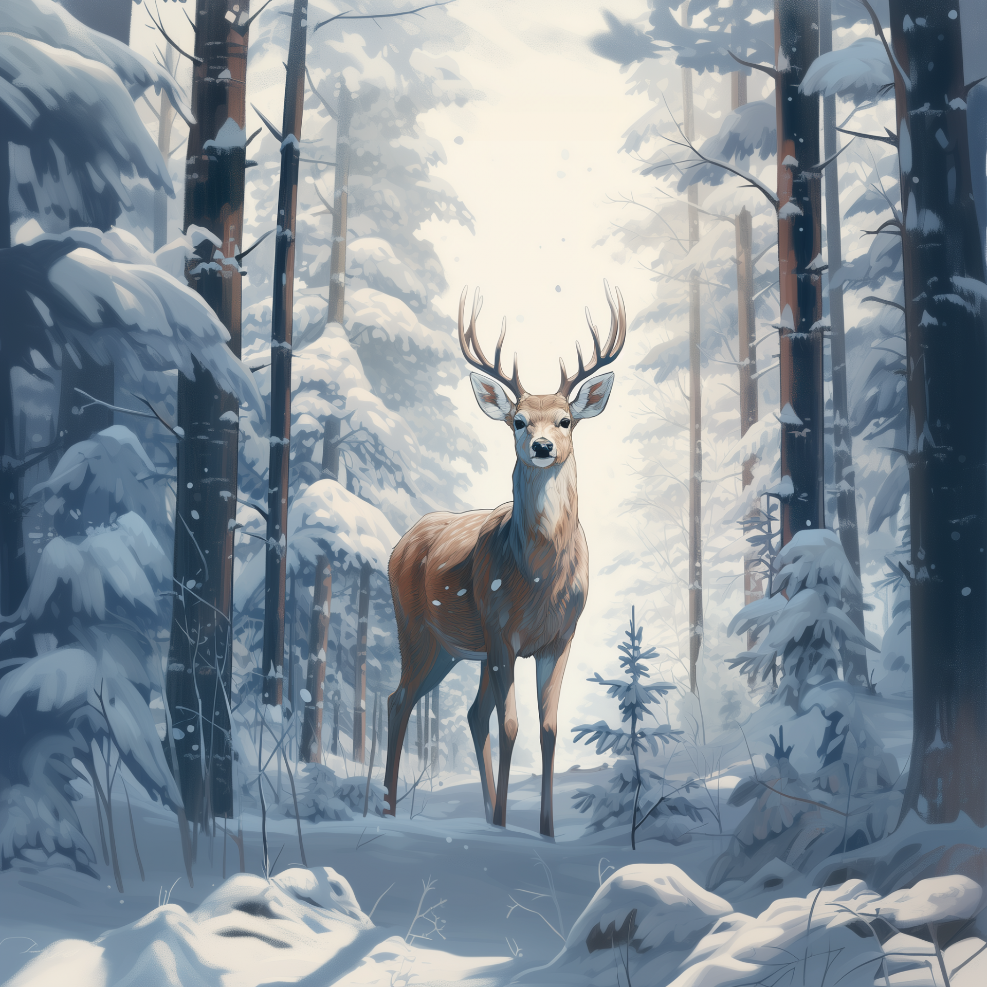 A beautiful doe stands gracefully in a serene clearing surrounded by tall pine trees, with soft snowflakes gently falling around. The graphic novel style adds a whimsical and enchanting feel to the tranquil winter scene.