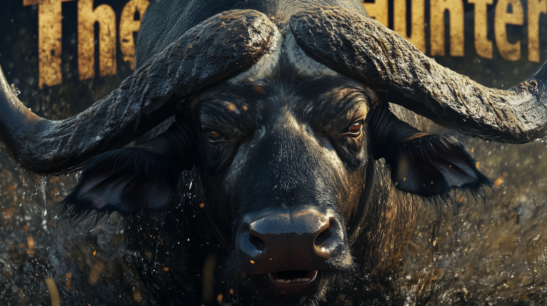 This image features an extreme closeup of a fierce water buffalo, its powerful expression captured as it charges toward the camera. The intense focus on the creature evokes a sense of raw energy and primal instinct against a blurred background.