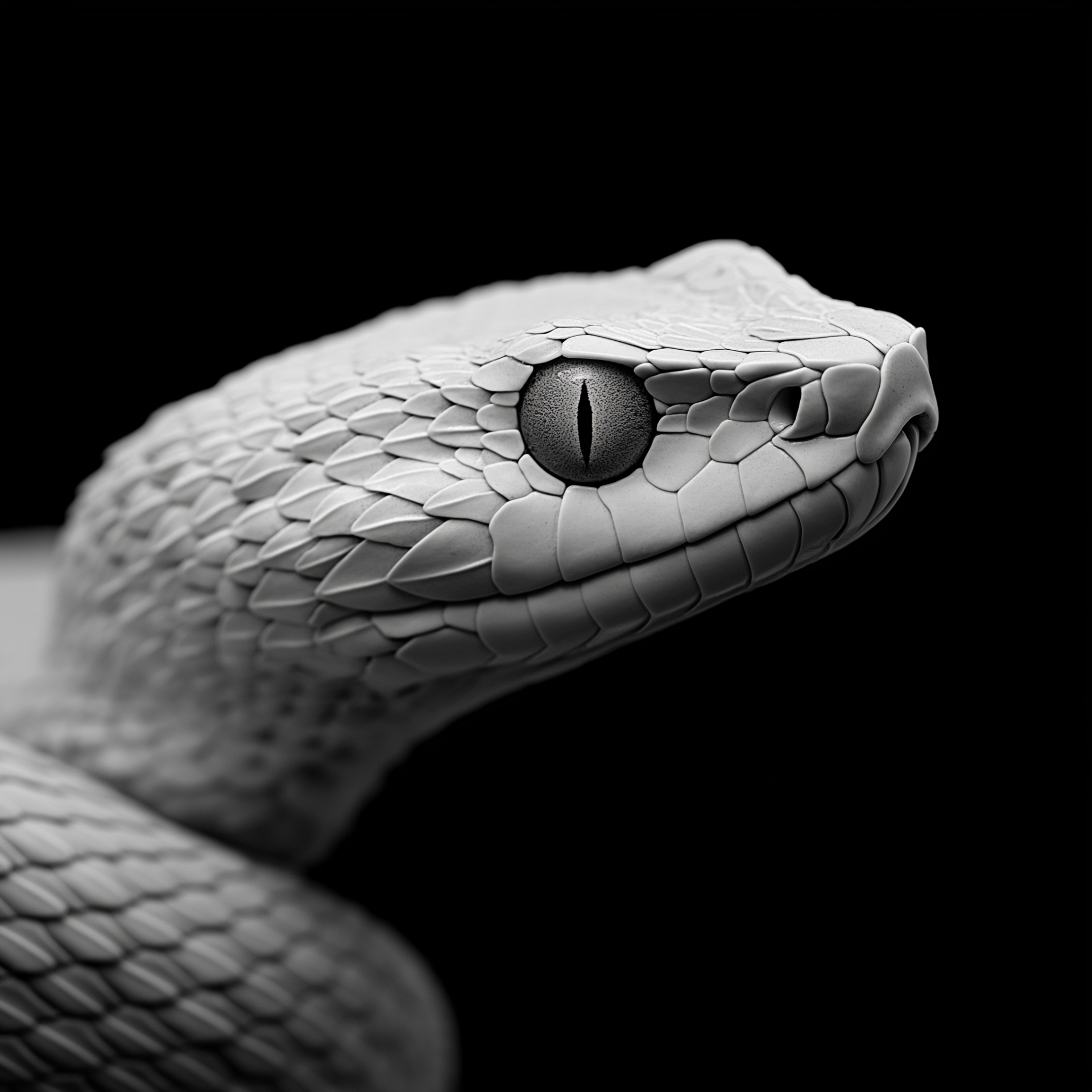 This image features a striking duo-tone representation of a bush viper against a black background. The contrast highlights the intricate details and textures of the viper's scales, creating a captivating and dramatic effect.
