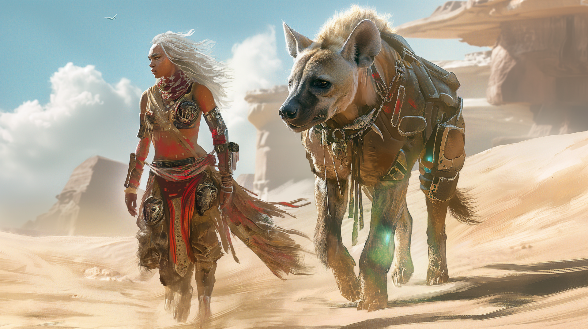 A fierce female warrior leads her colossal hyena through a vast desert wasteland. The scene is filled with hyperrealistic textures and gritty details, with towering sand dunes and a mysterious structure in the background.