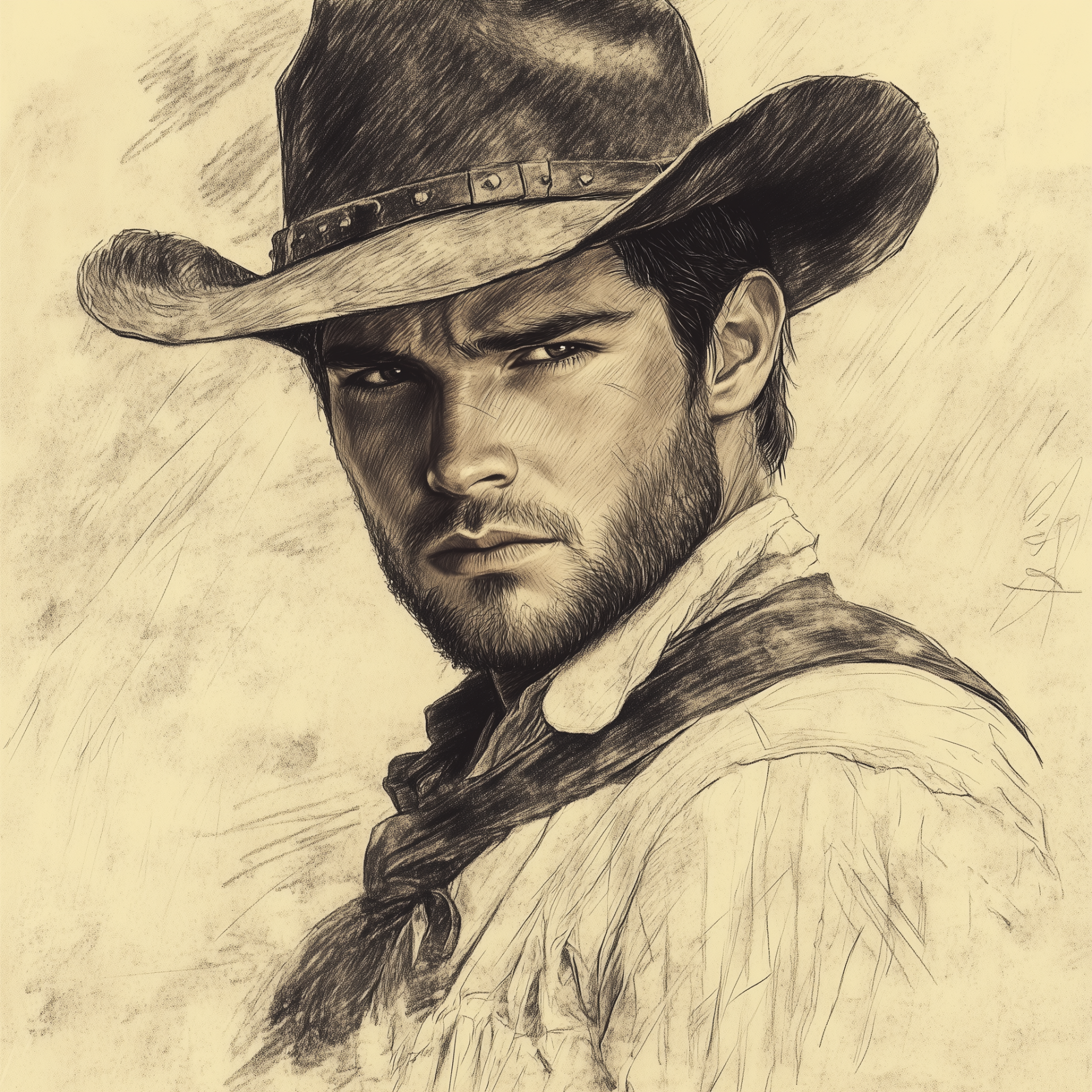 This illustration showcases a sepia pencil sketch of a young cowboy with black short hair and a beard. The simple drawing captures his grimace and rude expression, evoking a wild west atmosphere.