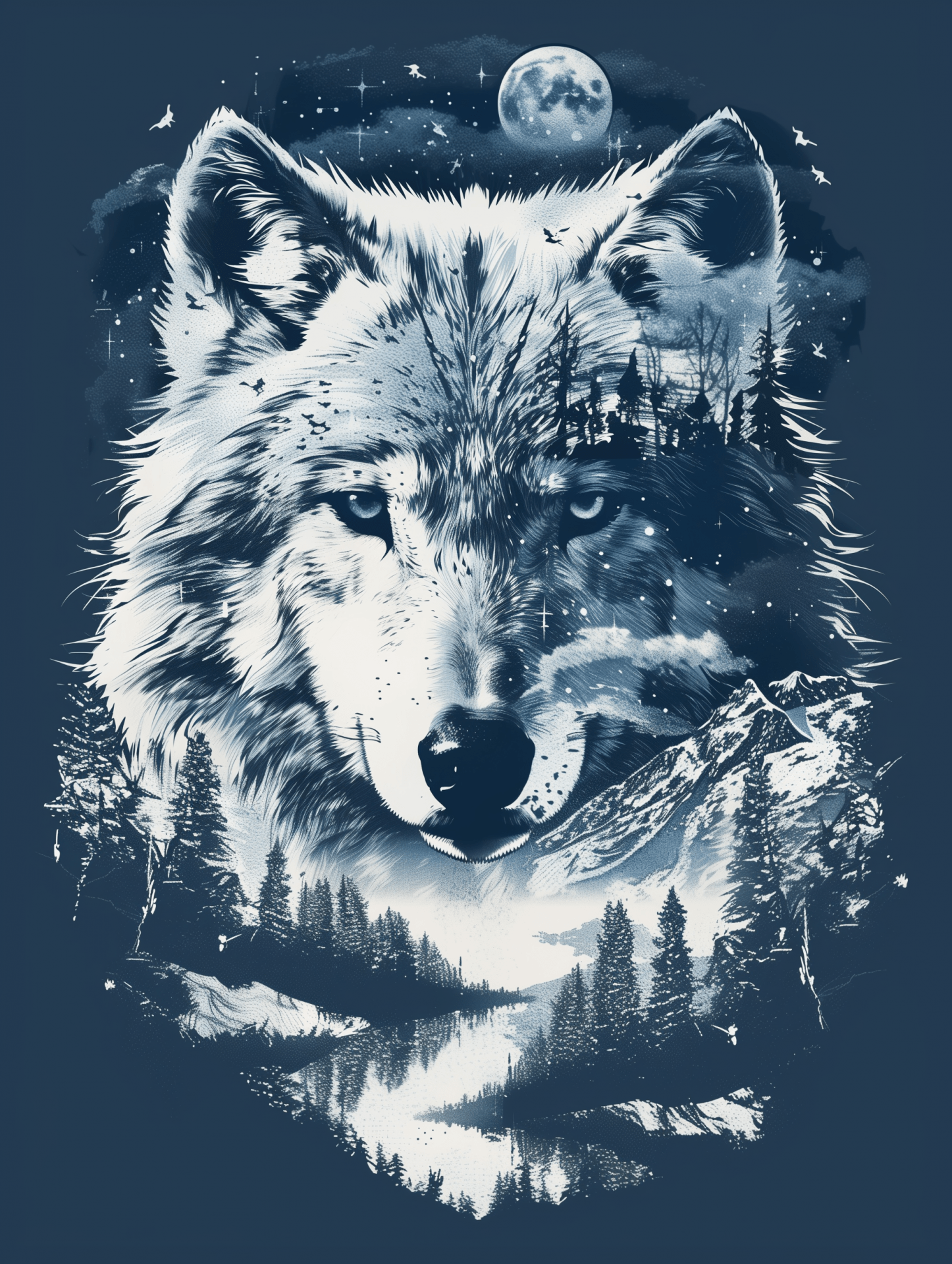 This graphic features a majestic snow wolf rendered in a tattoo-style illustration. The design embodies a sense of freedom and wilderness, showcasing intricate details and a bold aesthetic.