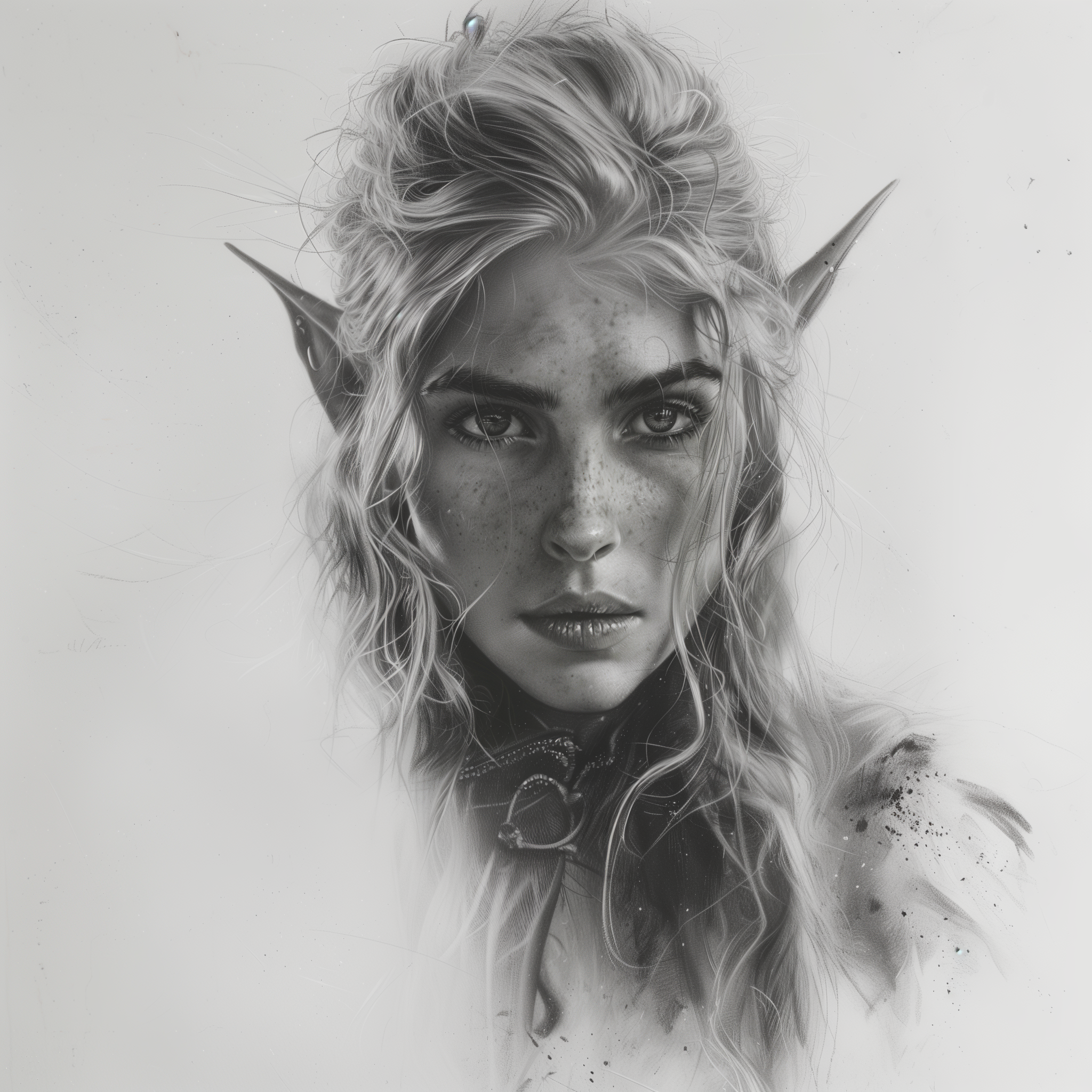 Monochrome portrait of an elf woman with pointed ears, intense eyes, and freckled features, emanating a mystical aura.