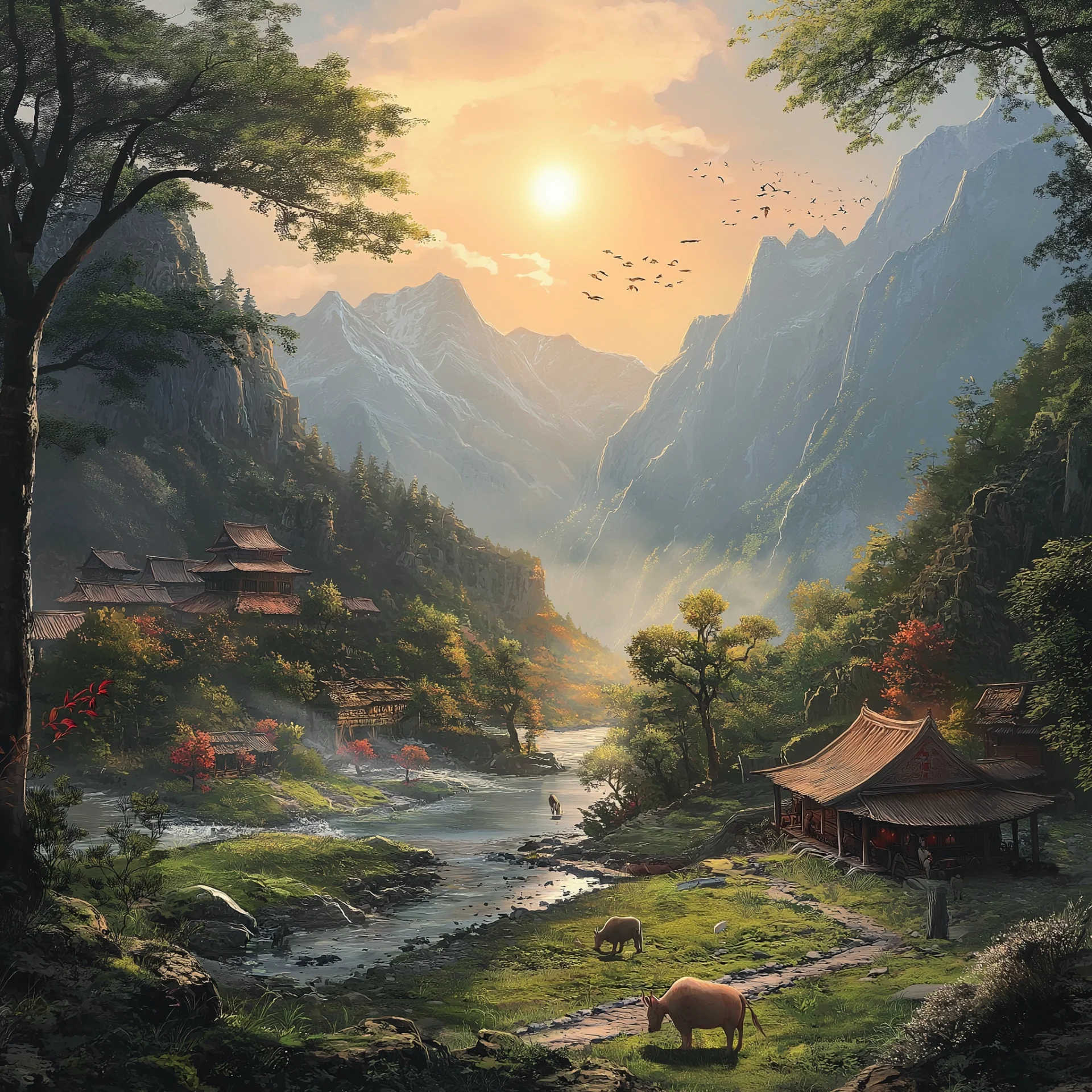 A cityscape viewed through gates of stone and wood, showcasing a town divided by three streets flaring off in different directions. The buildings, ranging from 2 to 4 stories, are constructed of faded stone in deep red, bluish hue, gray, or black, each turning slightly on its axis for varied views of the surroundings. Surrounded by spiked mountains, the scene exudes a photorealistic feel with a light illustration texture and cool color temperature.