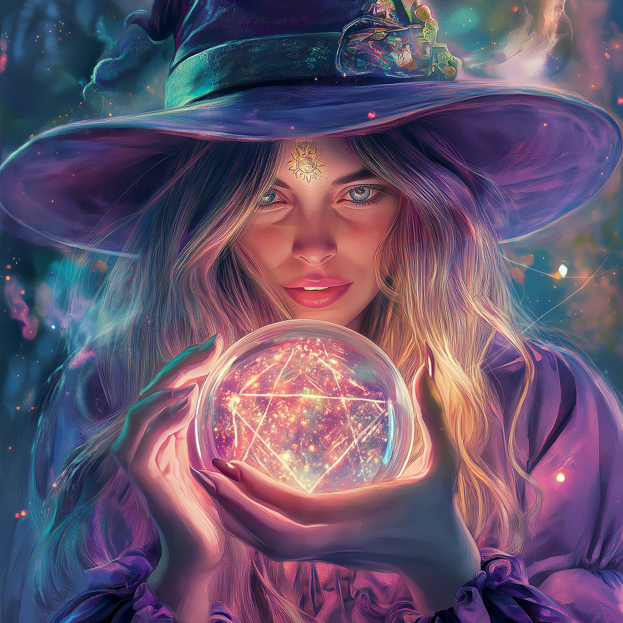 A mystical scene depicting a witch performing alchemy rituals under the night sky filled with stars. The pastel colors, crystal ball, and sacred geometry elements create a surreal and magical atmosphere.