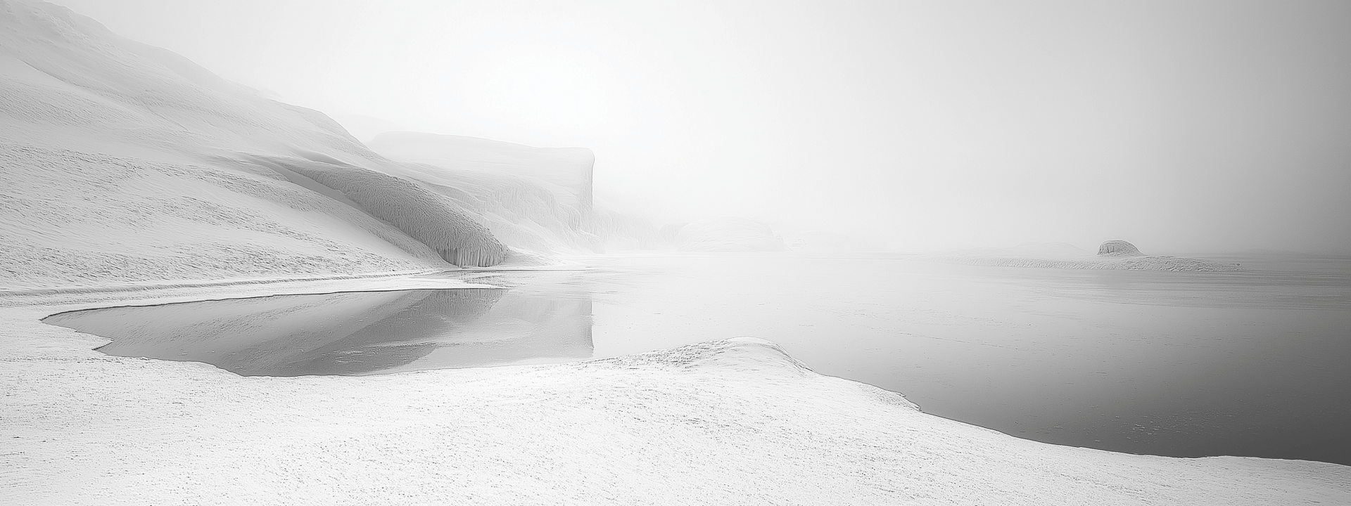 This image features a serene black and white winter landscape with a still lake reflecting the icy surroundings. Ice crystals can be seen adorning the surface, creating a peaceful and minimalistic winter scene.