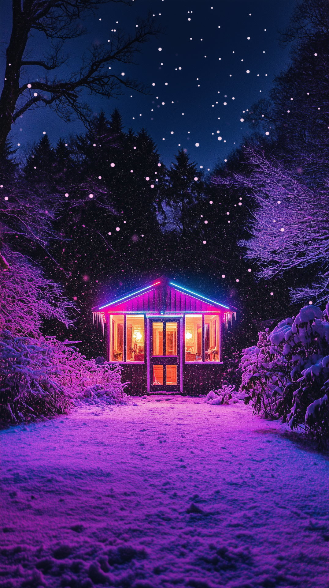 The image captures a serene summerhouse illuminated by colorful neon lights amidst a snowy winter night. A dark, star-filled sky envelops the scene, with a forest looming in the background, creating a contrast between warmth and the cold surroundings.