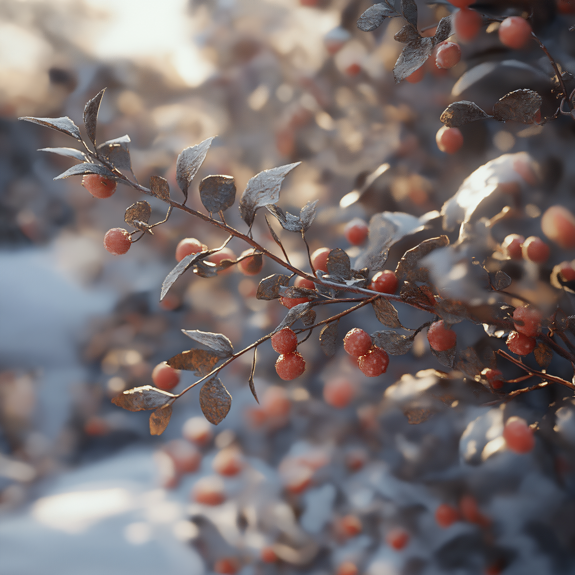 This image features a close-up view of vibrant winter berries covered in a delicate layer of snow. The warm tones of the berries contrast beautifully against the cold white snow, creating a cozy winter atmosphere.
