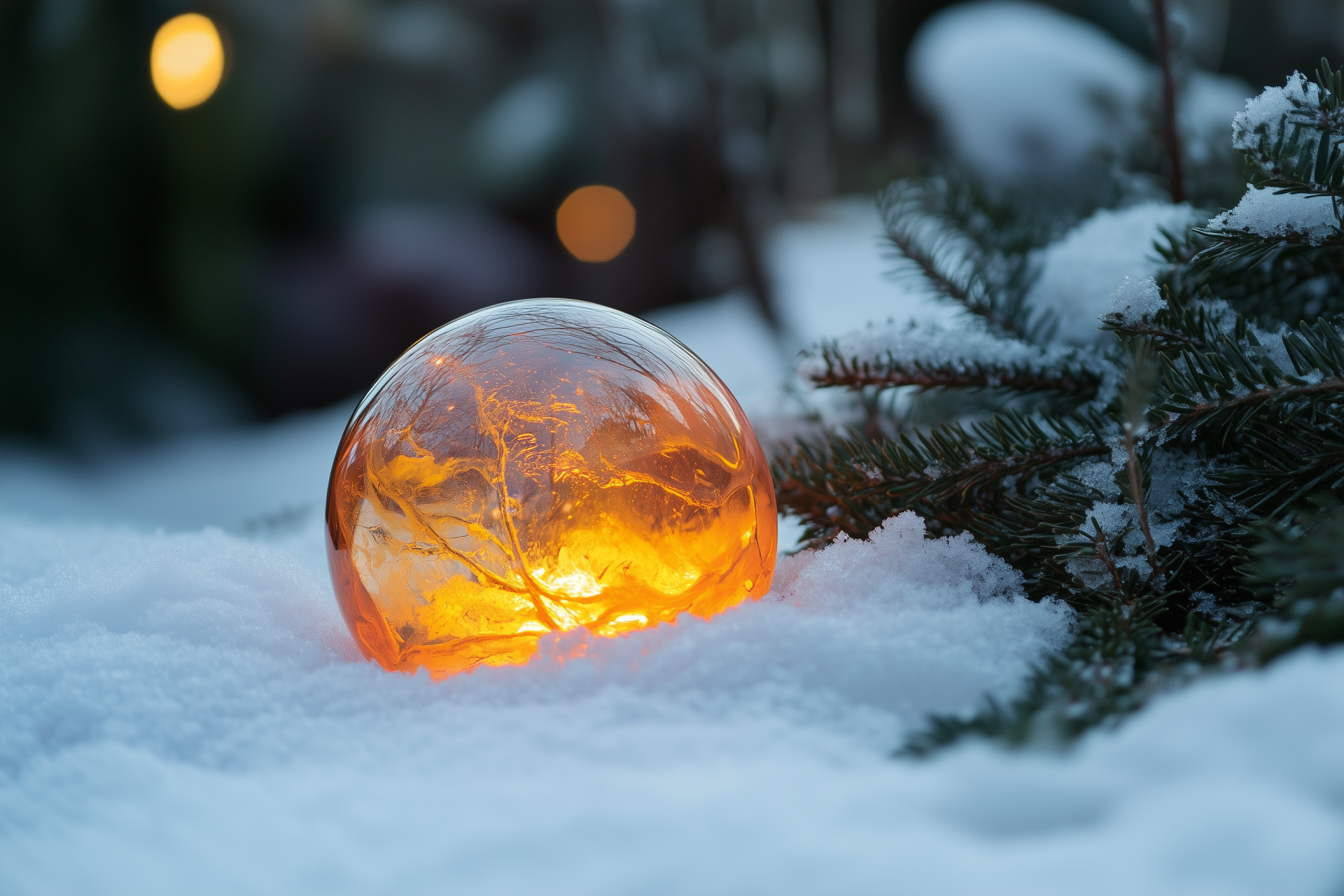 A decorative glass ball rests peacefully on a blanket of soft snow, radiating a warm orange glow. The contrast between the vibrant color and the cool white snow creates a serene winter atmosphere.
