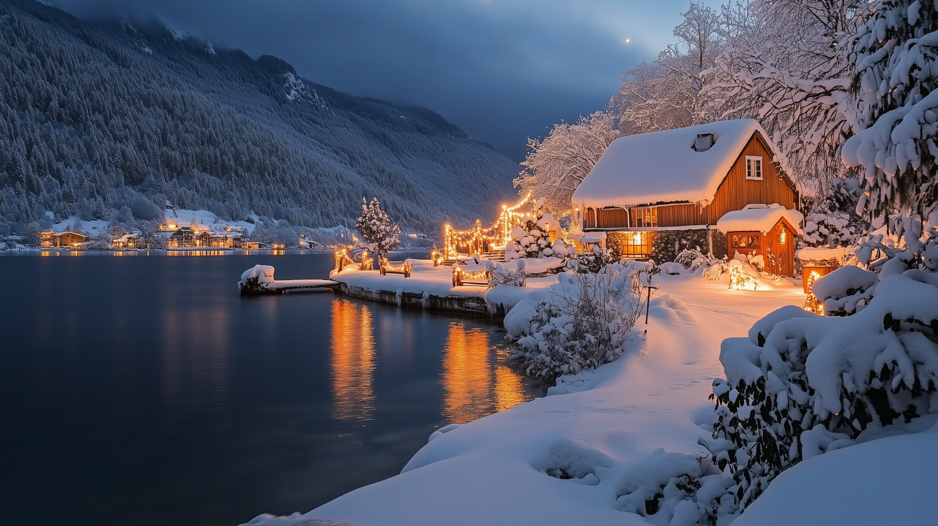 This image depicts a quaint small house nestled on a serene winter lake, surrounded by snow-covered mountains. The nighttime scene is illuminated with colorful lights and garlands, creating a magical atmosphere under a sky filled with stars and the aurora borealis.