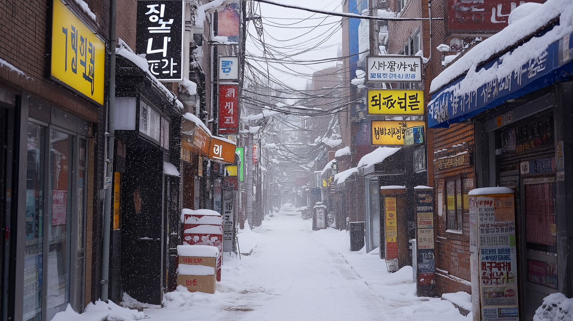 The image depicts a narrow alley in Seoul covered in a thick layer of fresh snow, reflecting a serene winter atmosphere. Neon signs illuminate the scene, adding a vibrant and modern contrast to the tranquil white landscape.