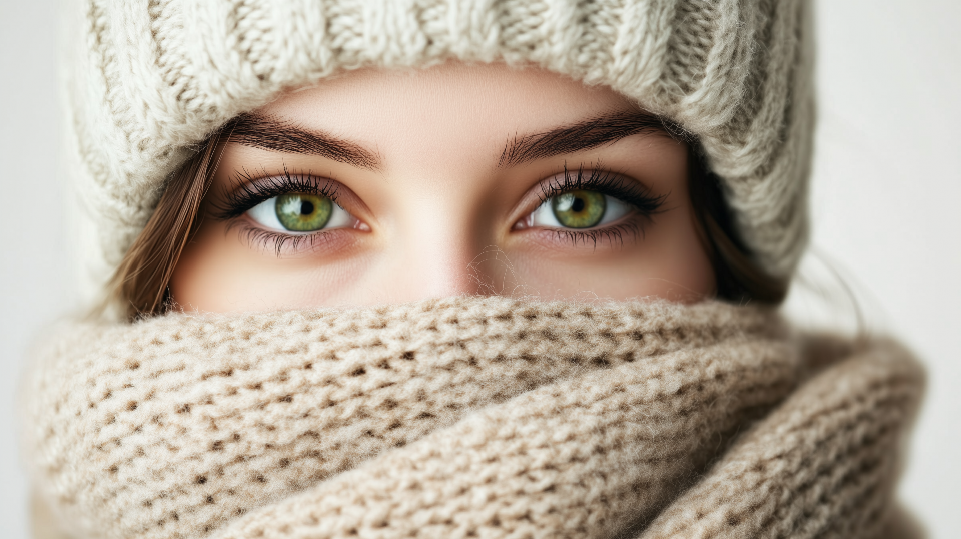 This close-up captures a girl with striking green eyes, while her winter hat and scarf partially obscure her face. The plain background emphasizes the calm and cozy atmosphere of the winter season.
