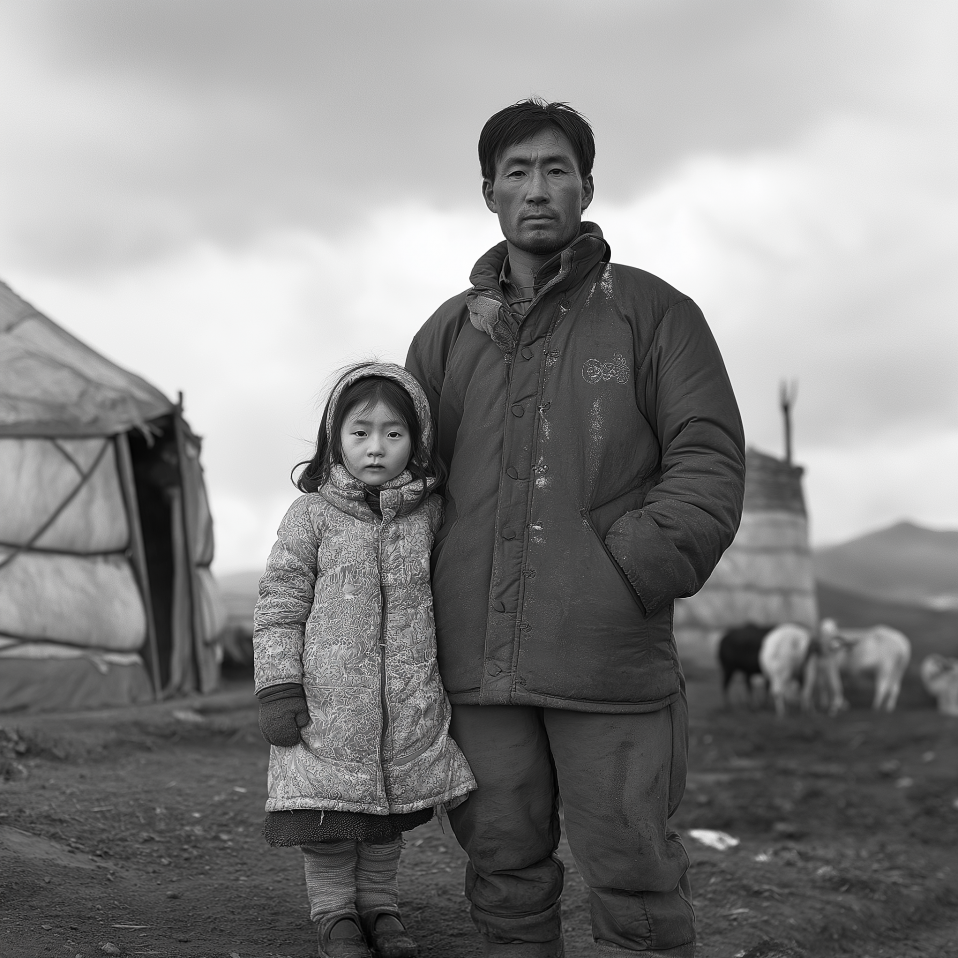 This image captures a poignant moment between a father and daughter dressed warmly for winter. The black and white tones evoke a strong emotional atmosphere, highlighting the bond and gentle calmness they share under a cloudy sky.