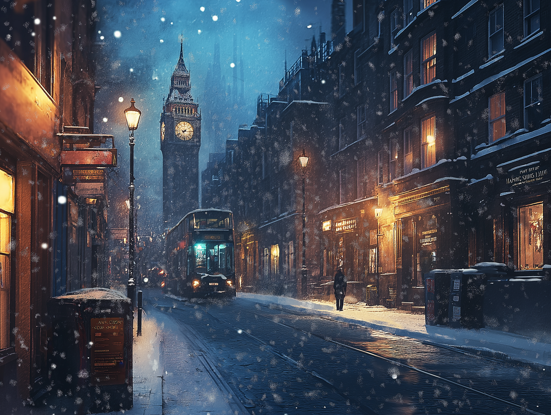 A serene view of a London street blanketed in soft snow at night. The soft glow of street lamps reflects off the pristine white, creating a dreamy and peaceful atmosphere.