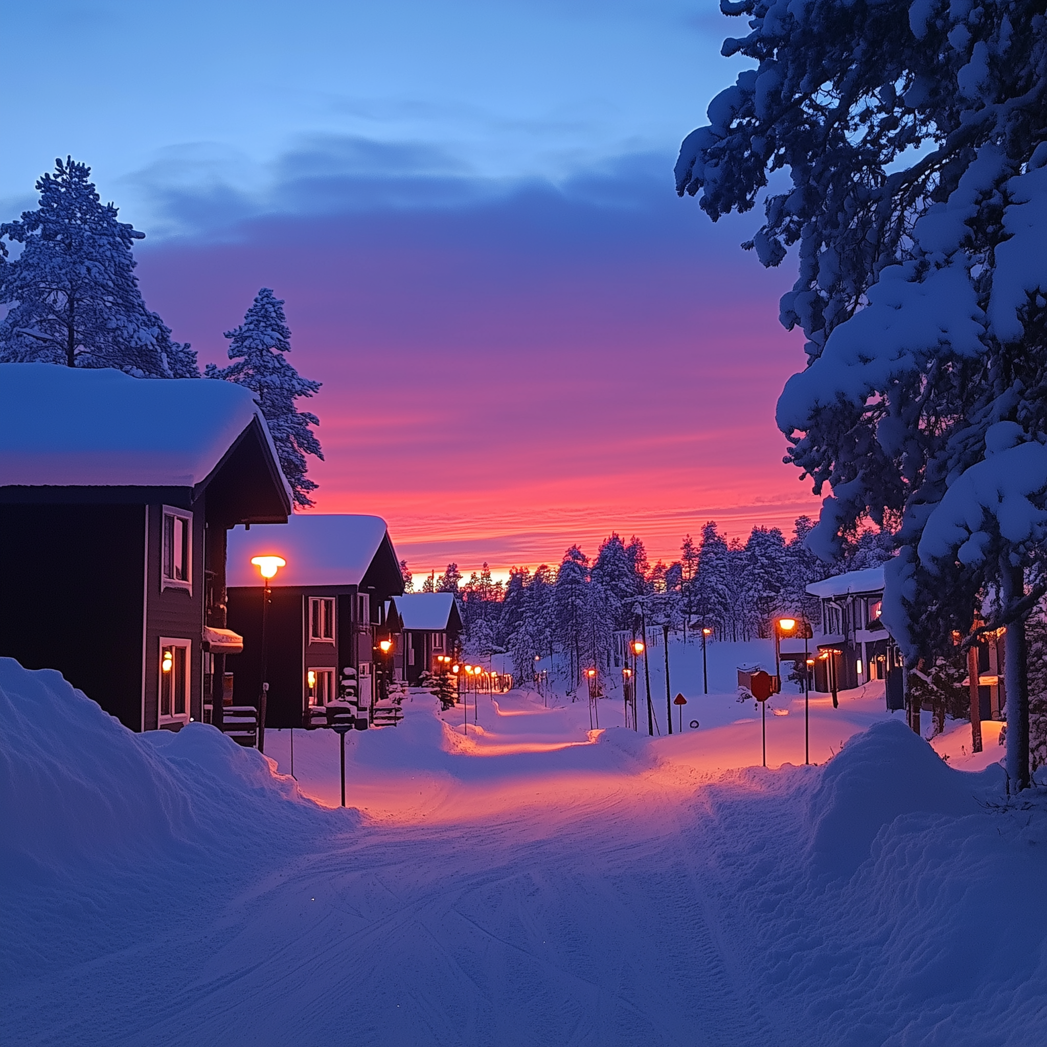The image captures a stunning winter sunset over a charming skiing village, showcasing an expansive panorama. The sky is painted in vibrant shades of red and blue, creating an ultra-realistic and serene atmosphere.