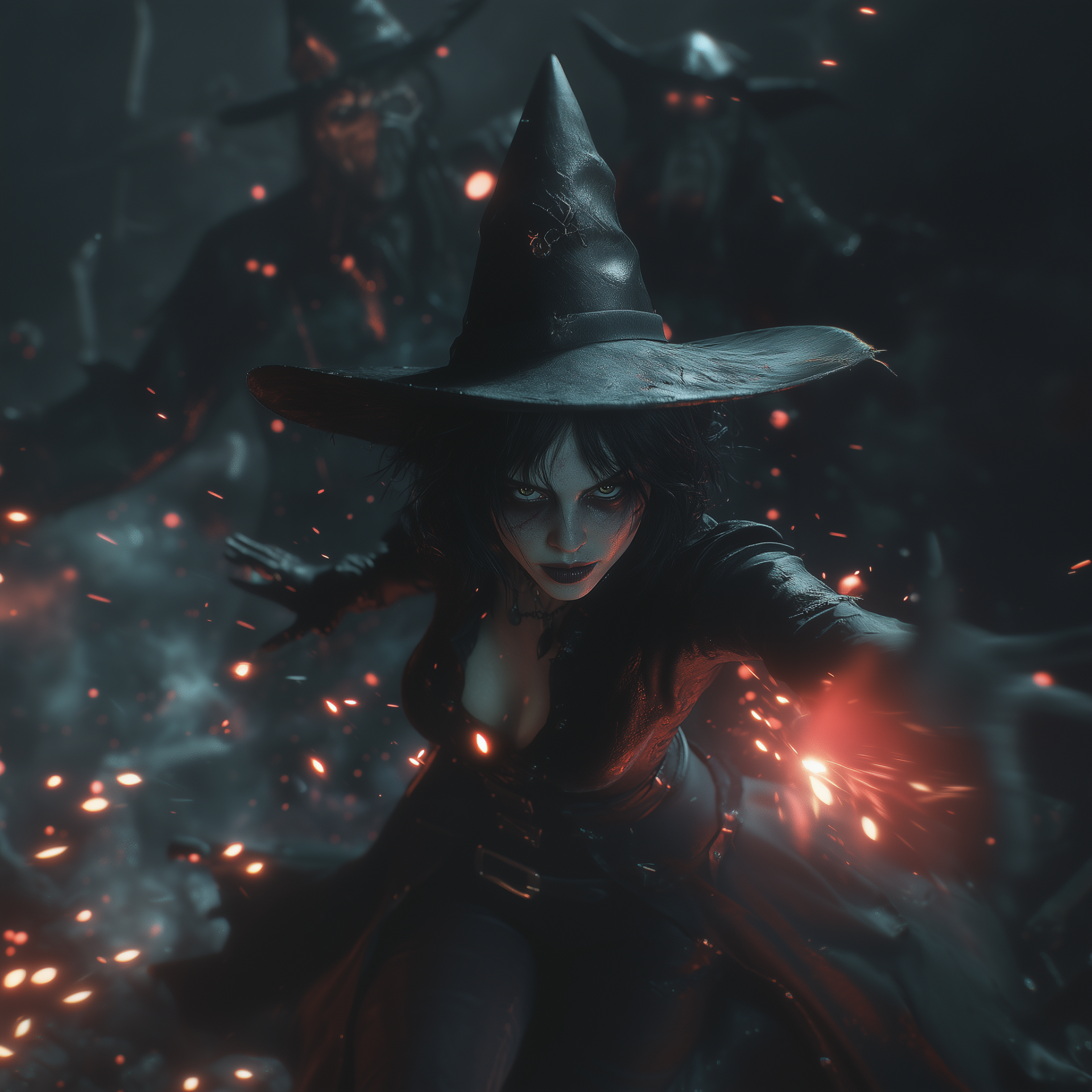 The image depicts a slender young witch with dark makeup and short messy black hair. She is dressed in gothic clothing, casting an earthquake spell amidst a dramatic scene filled with darkness and action.