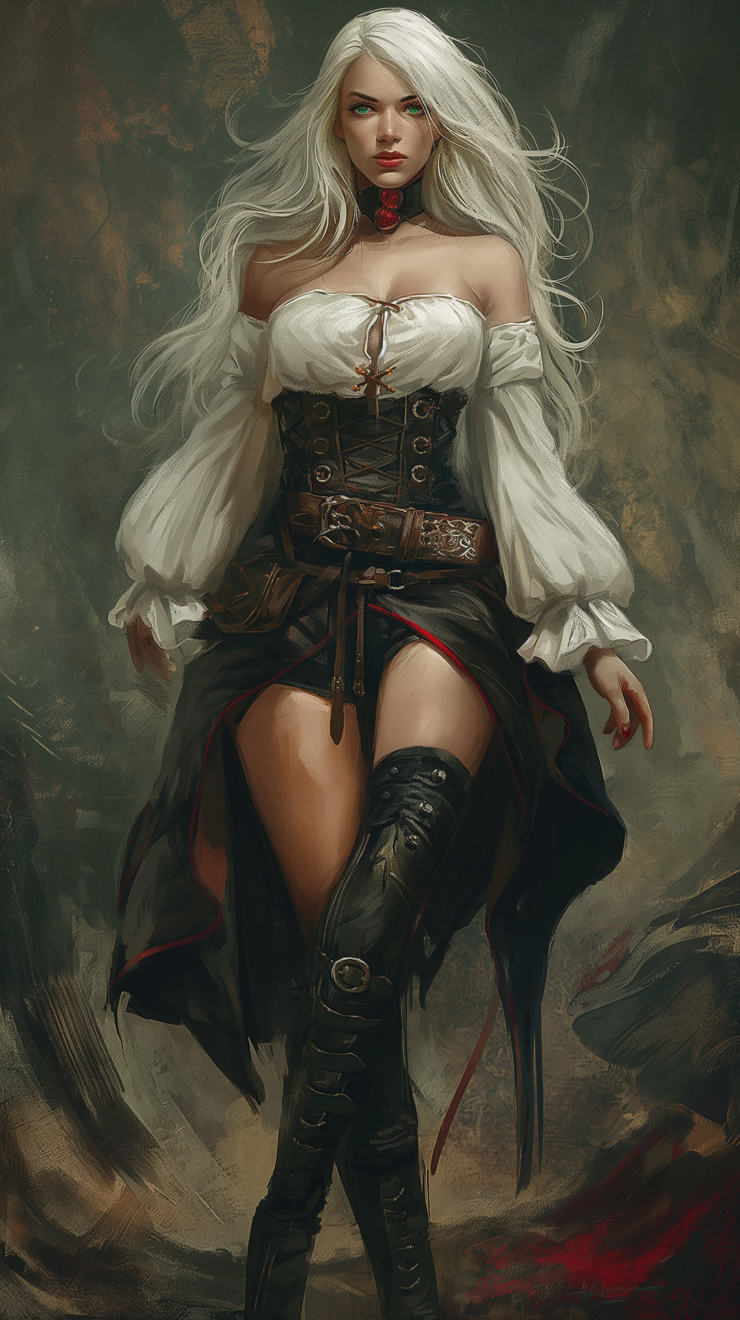The image features a mystical female witch with striking long white hair and captivating green eyes. She is dressed in a flowing white peasant's blouse paired with a long black skirt, elegantly accented in red, evoking a sense of enchantment and mystery.