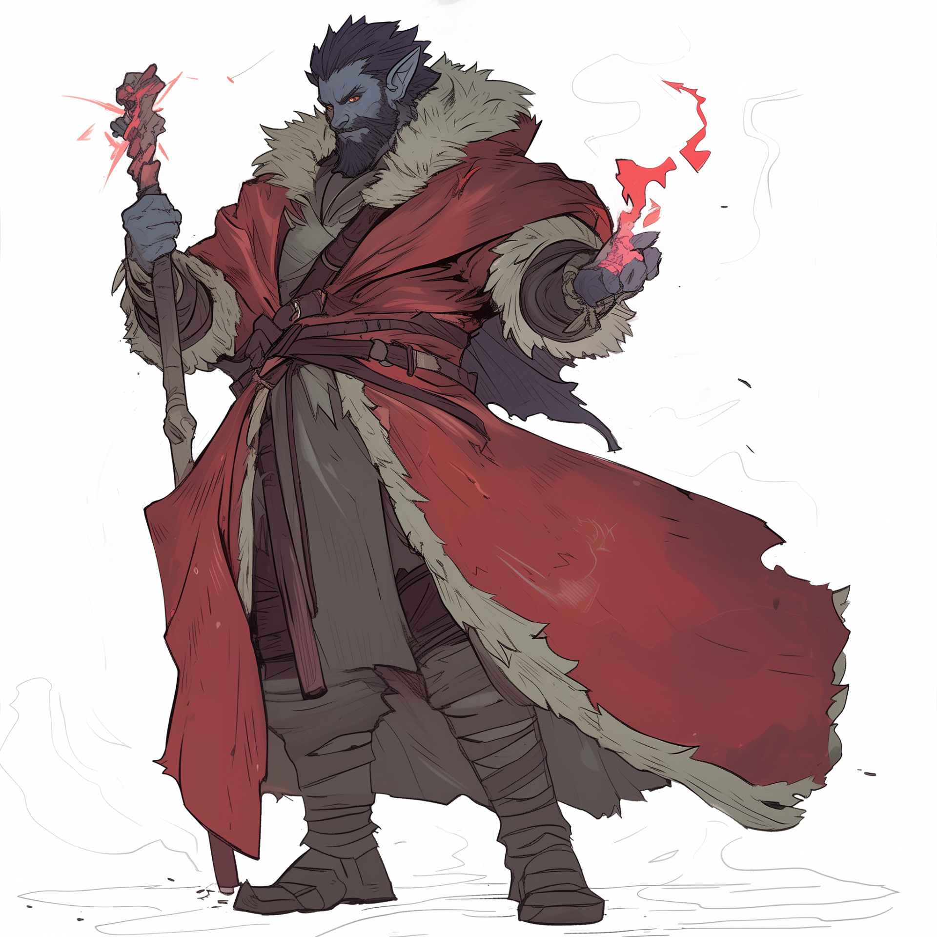 The image depicts a firbolg warlock with distinctive grey skin and a prominent red nose. He is cloaked in a dark outfit, and magic erupts dramatically from his staff against a uniform white background.
