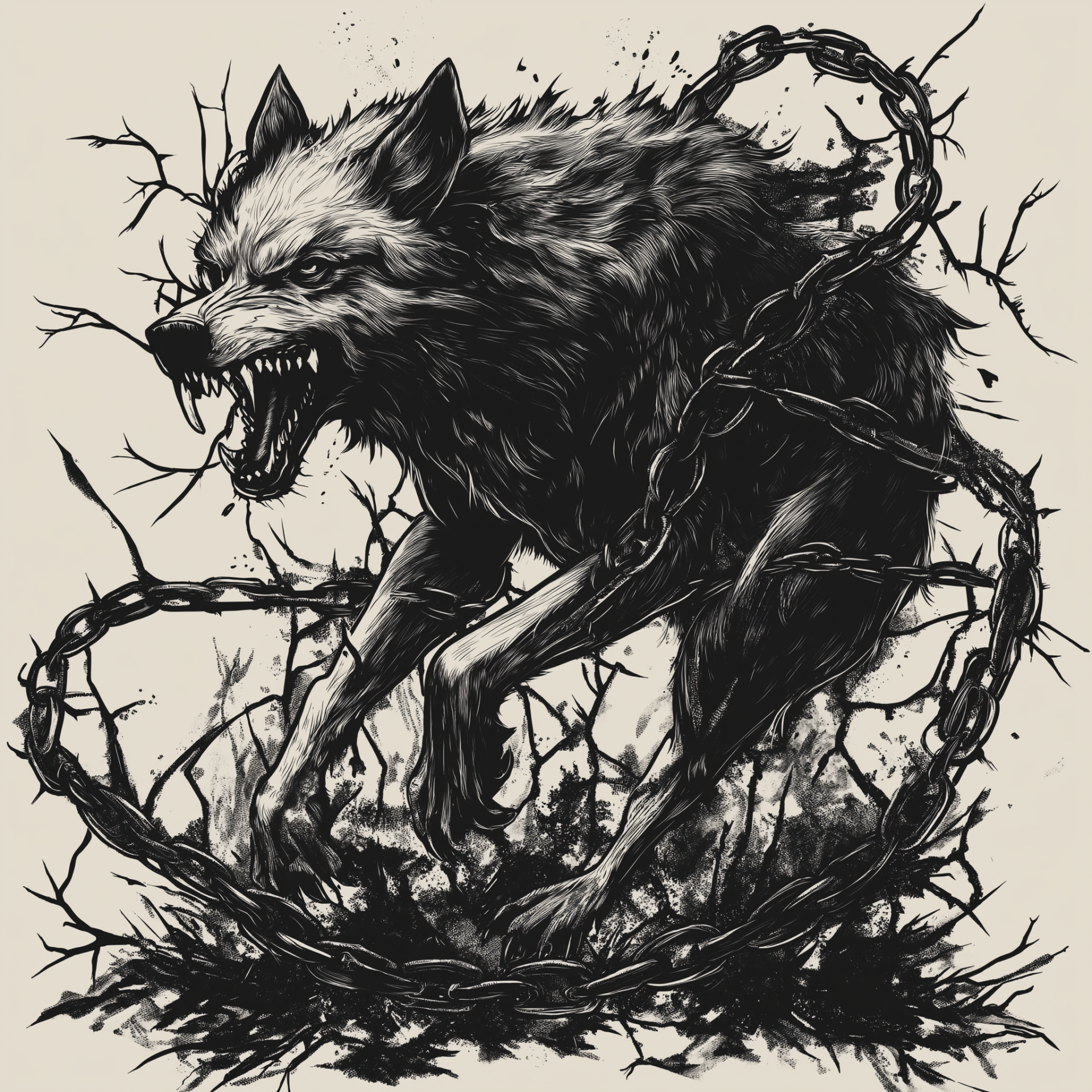 This striking illustration features a realistic depiction of a powerful wolf breaking free from chains and thorns. The dark ink style emphasizes the intensity of the wolf's growl, creating a sense of strength and liberation.