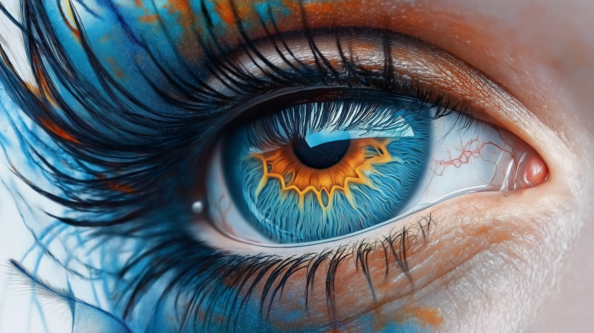 This image showcases an extreme close-up of a stunningly beautiful eye, capturing the intricate details and colors. The lighting highlights the natural beauty and depth, creating a captivating and intense focal point.