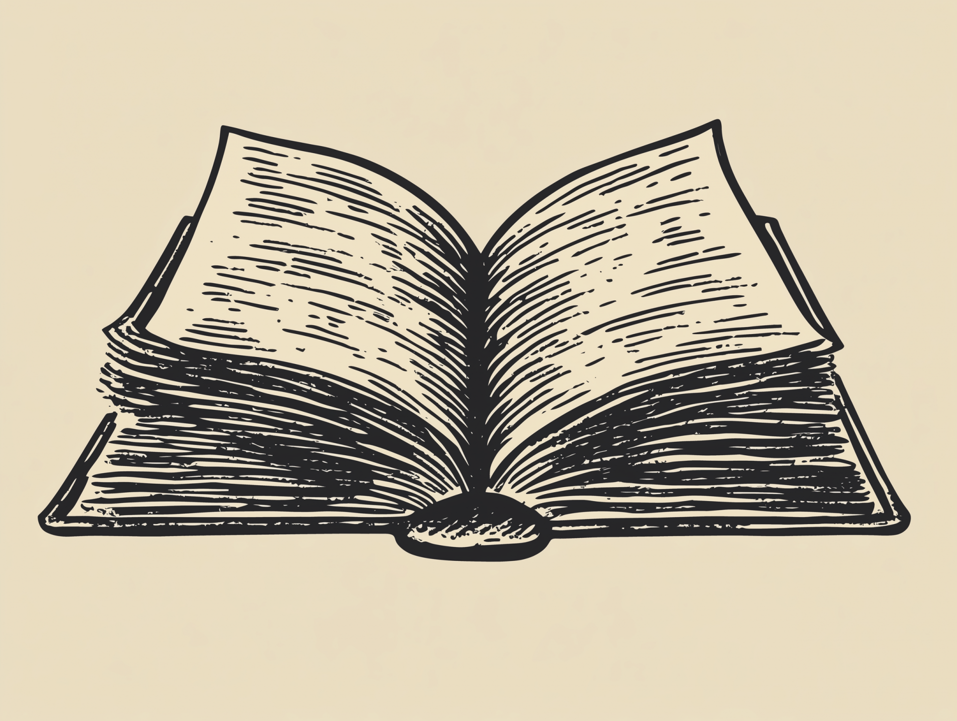 The image features an open book depicted in a woodcut style, characterized by bold lines and a simplistic design. The top-down view emphasizes the flat placement of the book, creating a striking and artistic composition.