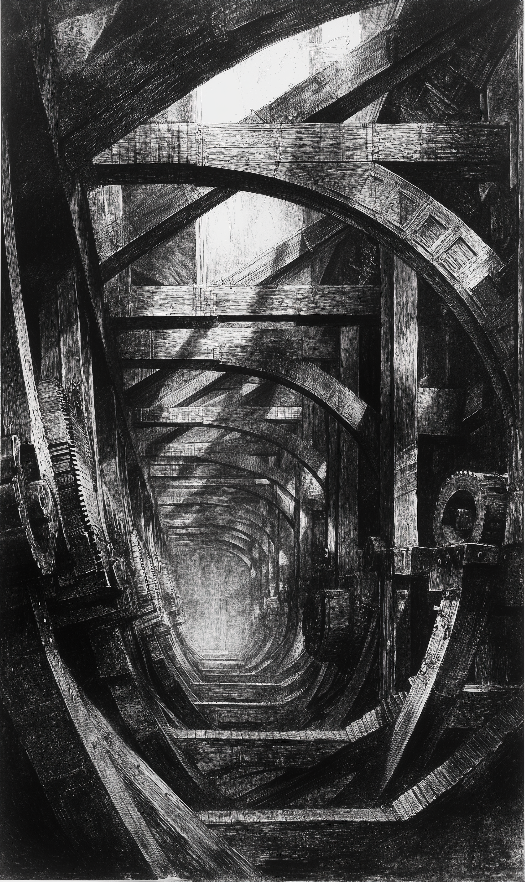 This illustration depicts a detailed underground hall resembling the intricate interior of a wooden machine. Giant wooden gears, beams, and metal fittings create a captivating sense of depth and complexity, evoking a mysterious mechanical ambiance.