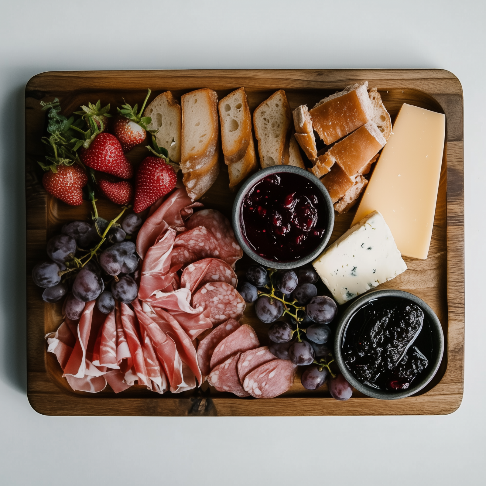 The image showcases a beautifully arranged wooden charcuterie board viewed from above. Delicate slices of various meats and cheeses are elegantly presented, creating an inviting and appetizing display.