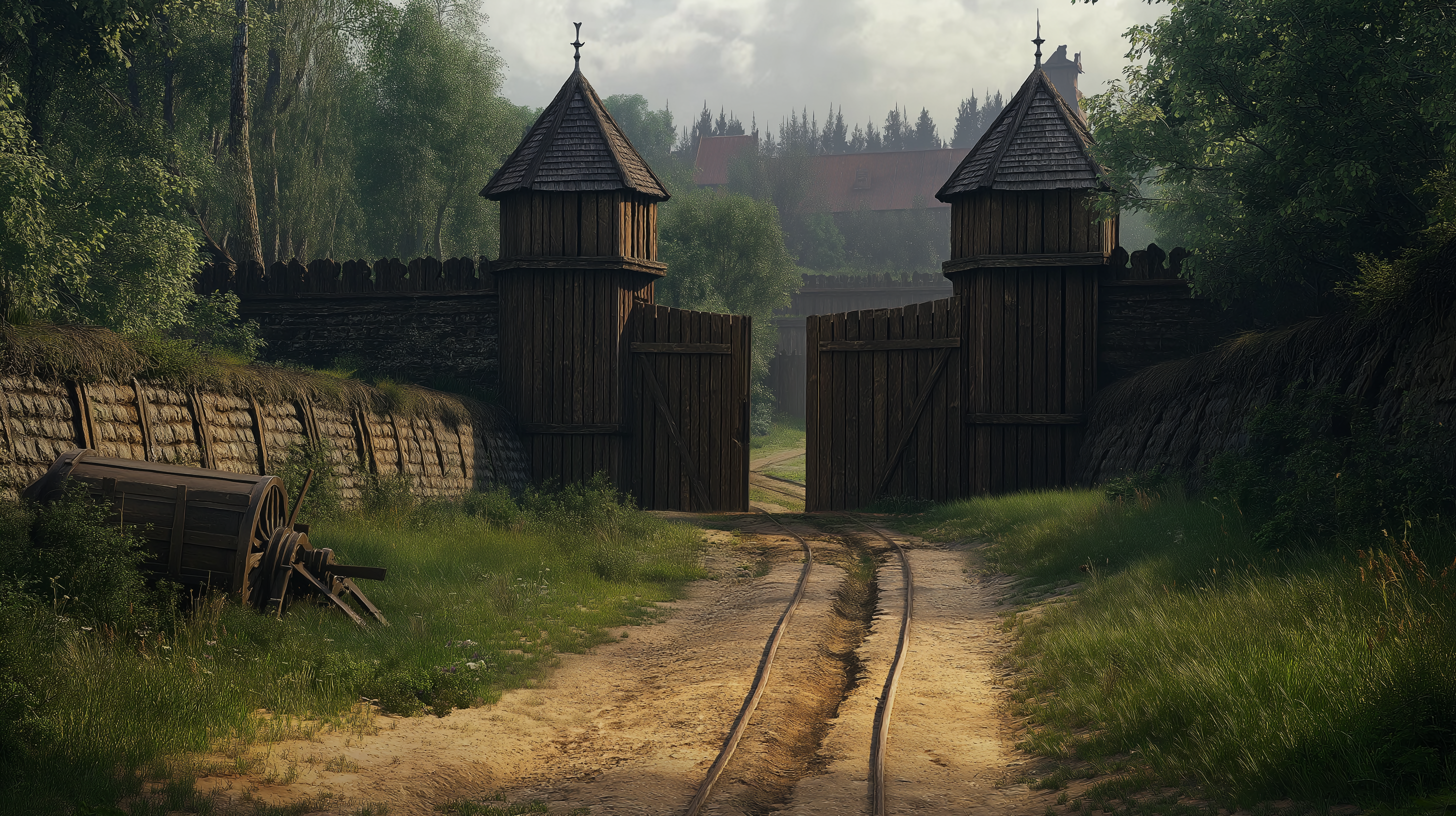 The image depicts the closed gates of a wooden stockade surrounded by high walls, set against a backdrop of dense wilderness. A narrow dirt road leading up to the gates shows traces of past wagon tracks, enhancing the medieval atmosphere of the scene.