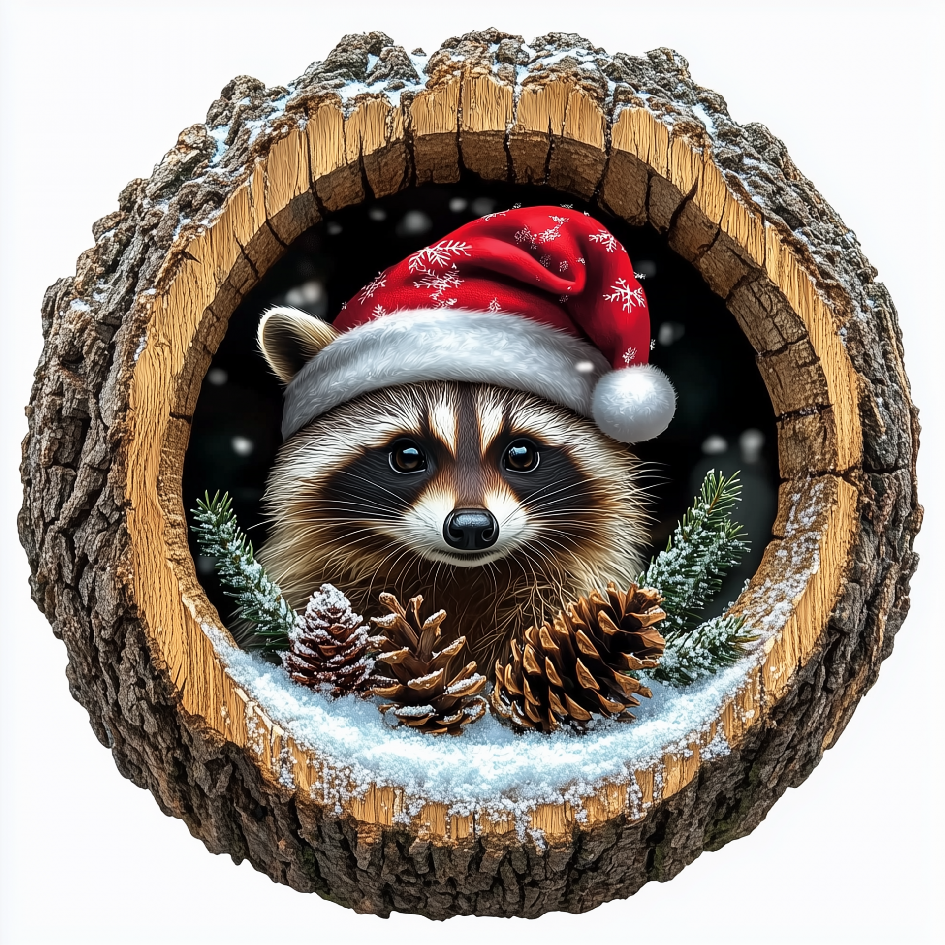 This image captures a rounded wooden hollow showcasing a whimsical scene inside. A cute raccoon wearing a Santa hat stands among snow and pine cones, creating a festive feel.