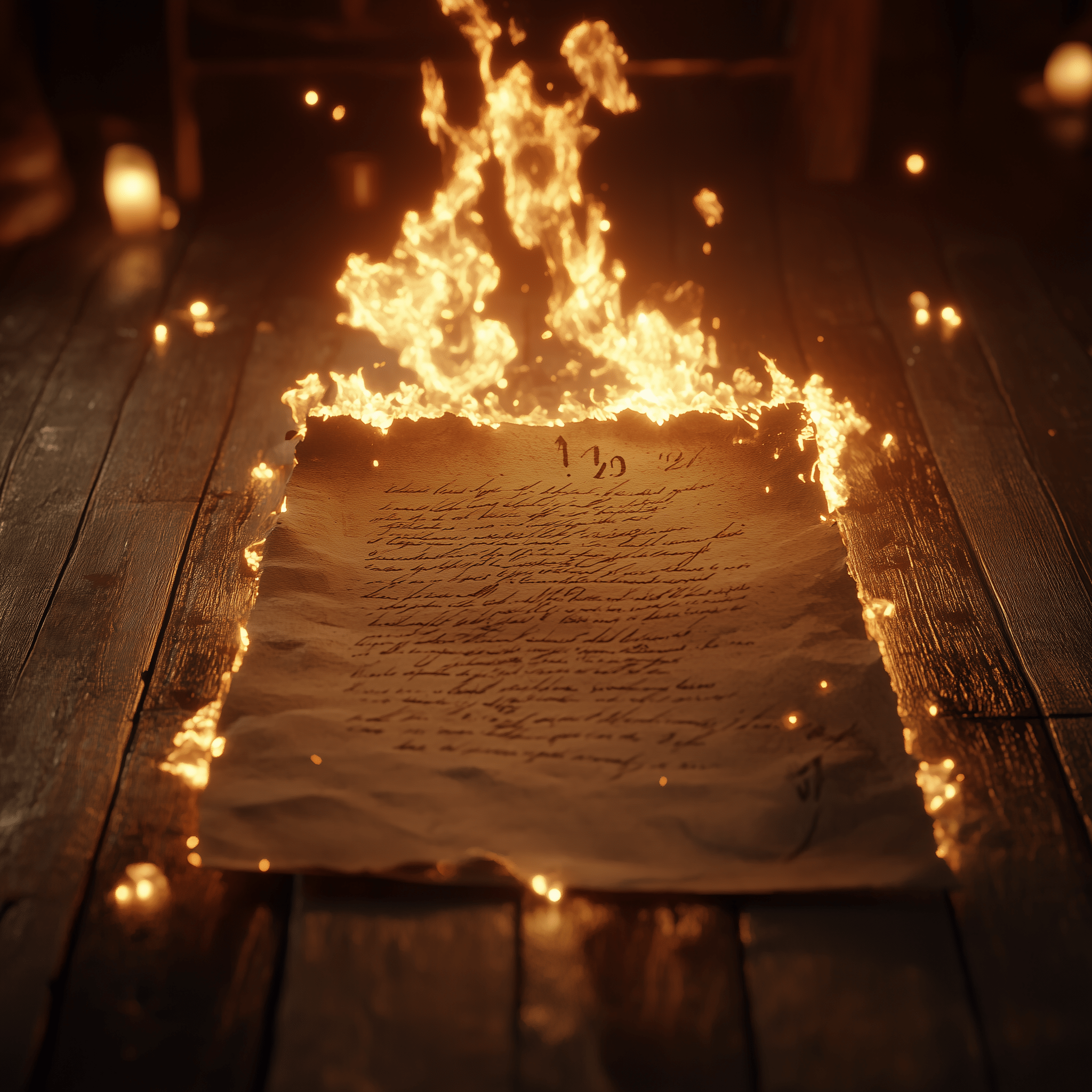 The image features a piece of aged paper engulfed in flames, casting a warm glow in an amber wooden room. The interplay of light and shadows creates a dramatic atmosphere, highlighting the intricate texture of the paper and the surrounding wood.
