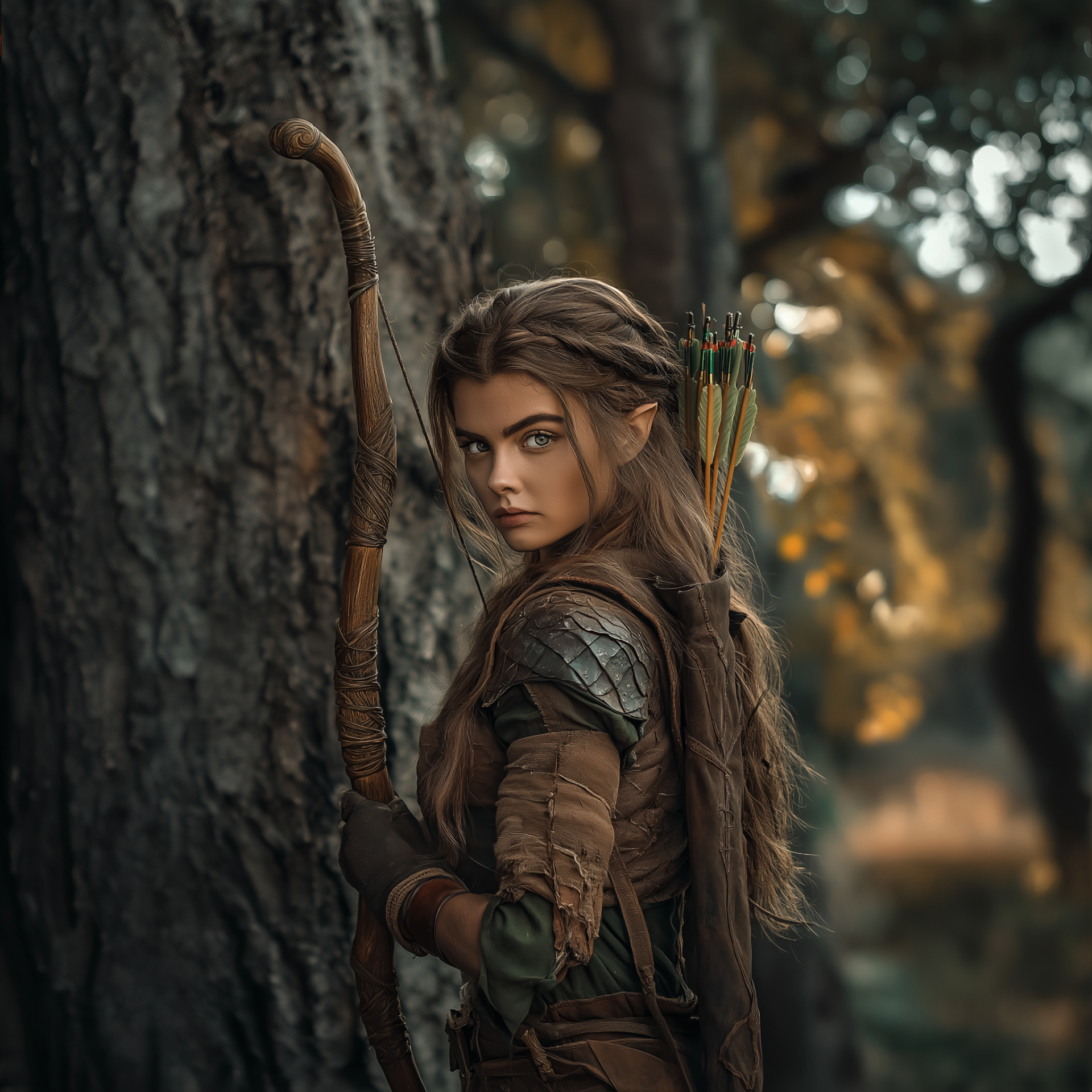 A female wood elf embodies a fierce and enchanting presence, dressed in intricately crafted hide armor. With long brown hair edged in green and piercing green eyes, she stands poised with her long bow, ready for adventure in a magical forest.