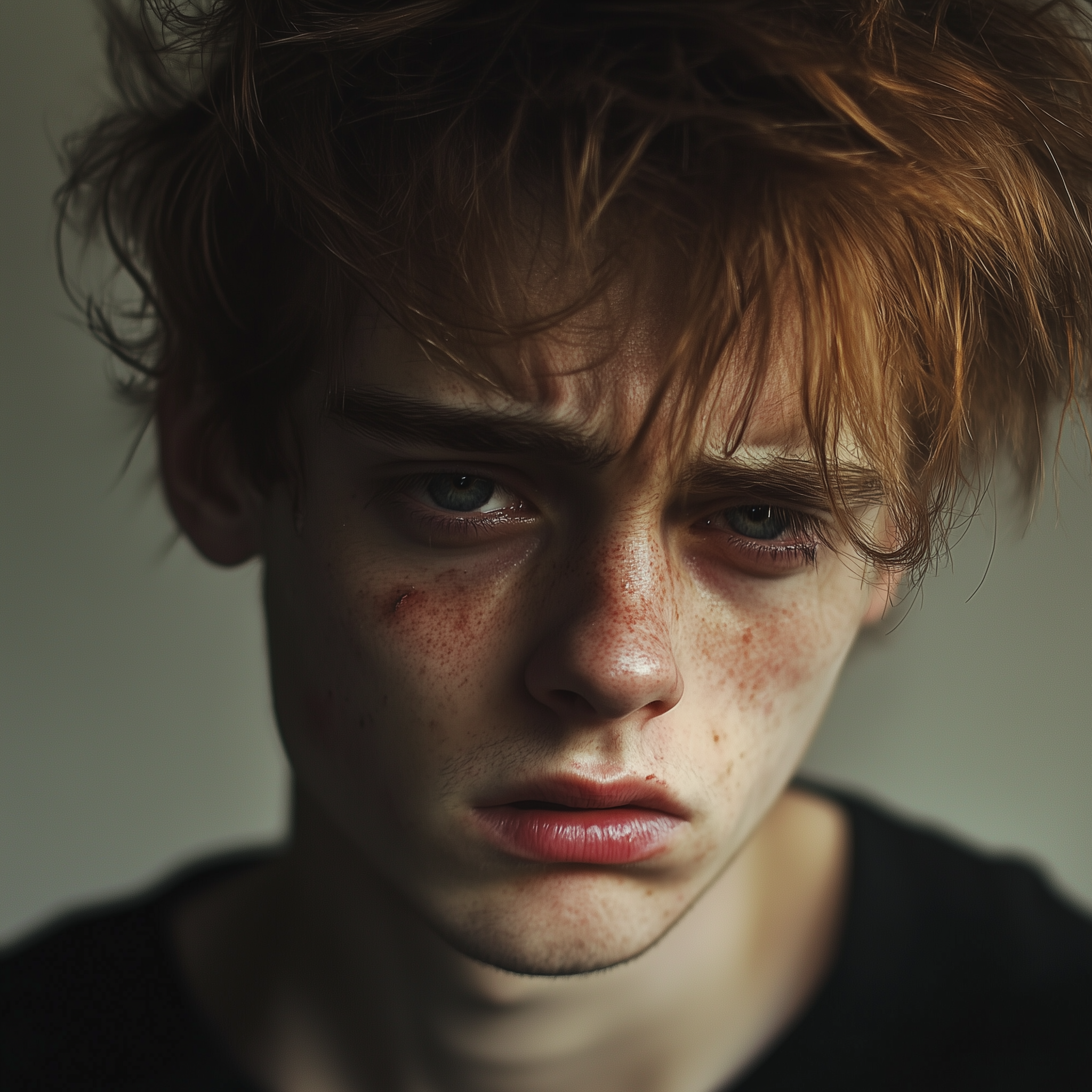 The image depicts a thin young man in his late teens with greasy hair and sunken eyes. His expression conveys a sense of handsomeness mixed with weariness and worry, capturing a moment of contemplation.