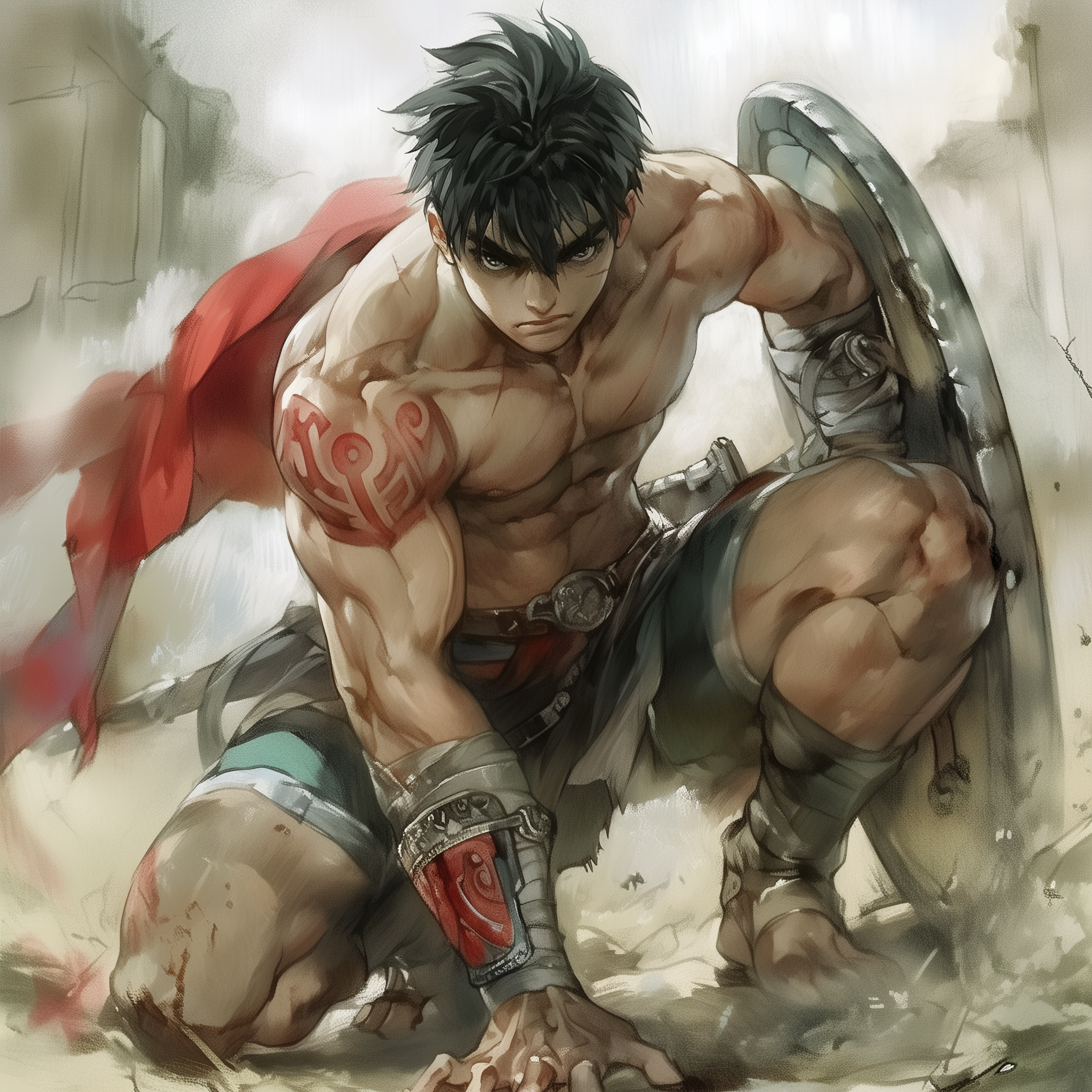 The image depicts a muscular young warrior with black hair, kneeling in a dramatic pose. His angry expression and intricate red tattoo add intensity to the watercolor manga style.