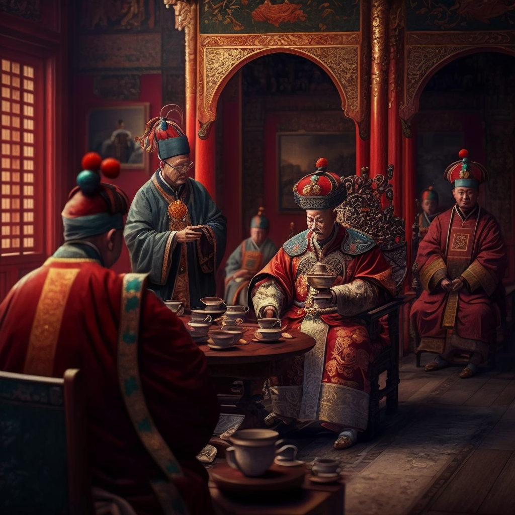The image showcases a Chinese emperor seated among his courtiers in an opulent palace setting. Rich red and gold colors dominate the interior, creating a regal atmosphere as they engage in a traditional tea-drinking ceremony.